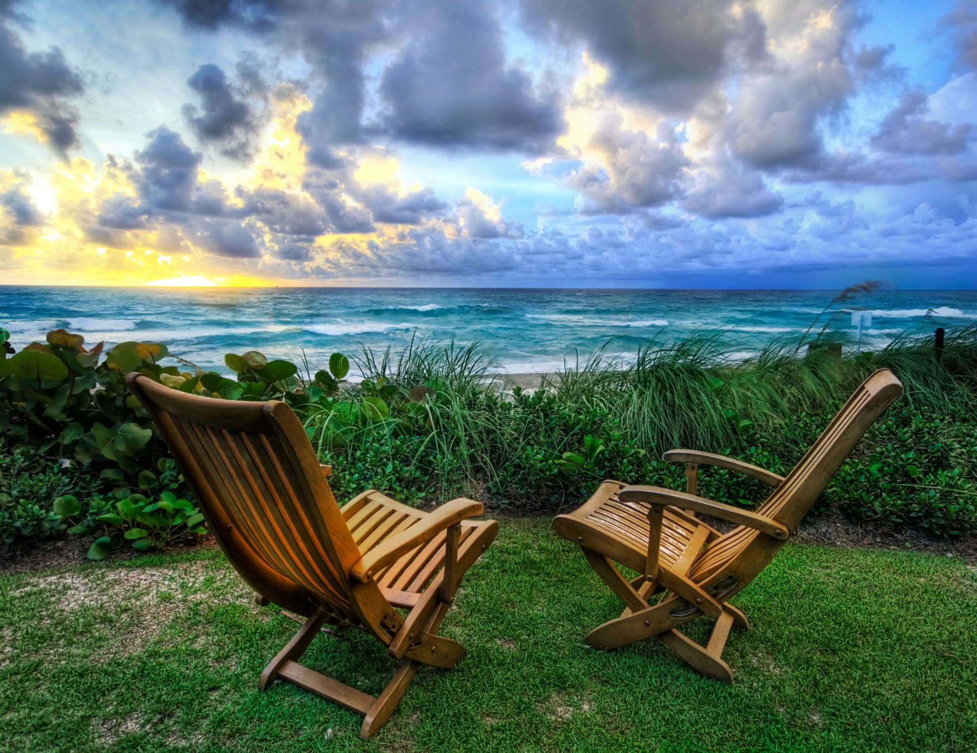 Sonnenaufgang am Meer. Bungalows und Palmen