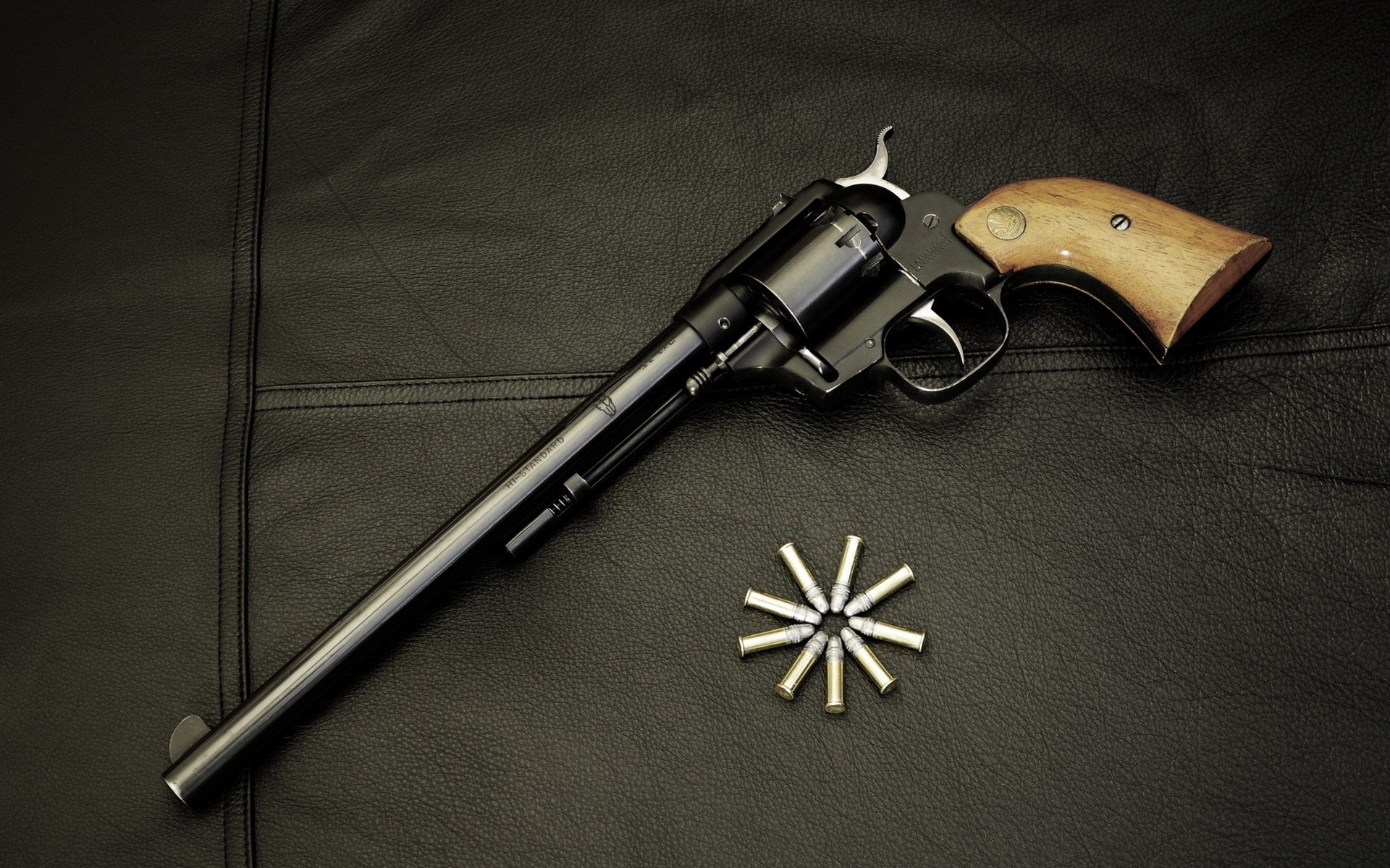 Pistole mit Kugeln auf der Ledercouch