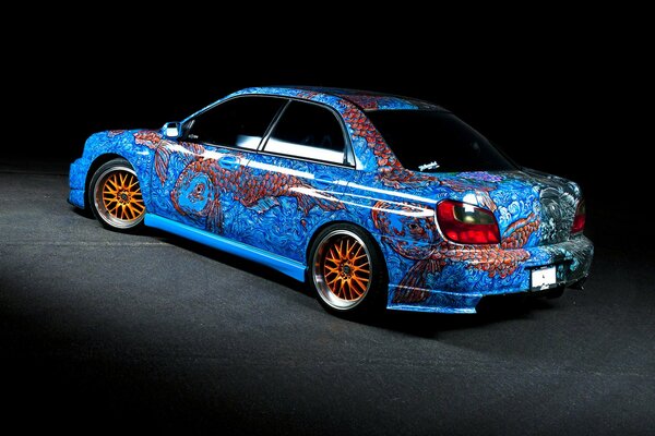 Blaues Auto mit roten Bremssätteln auf Garagen Hintergrund