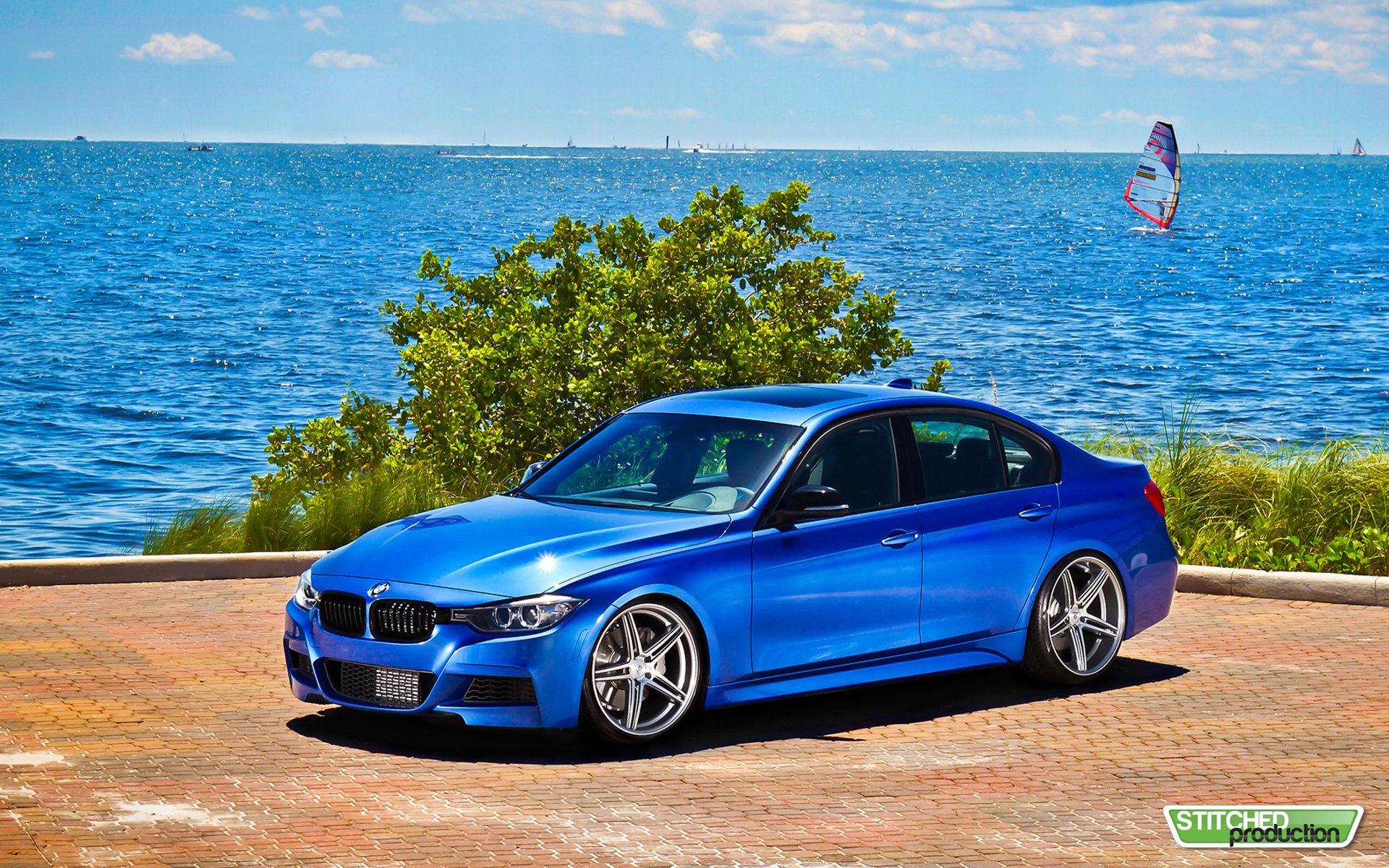Blaues Auto auf dem Hintergrund des Meeres. BMW