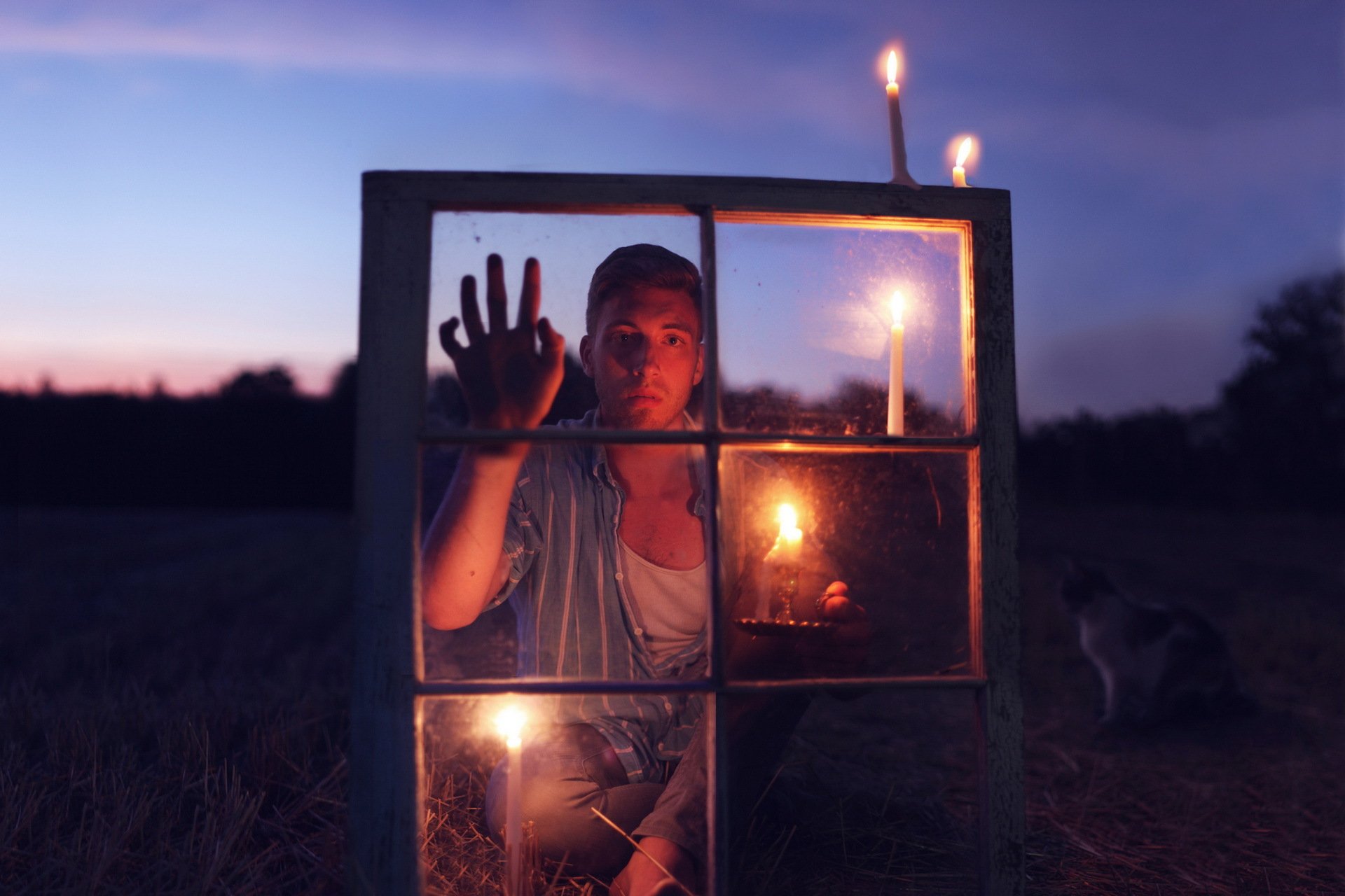 Ein Kerl mit einer Kerze schaut durch das Fenster