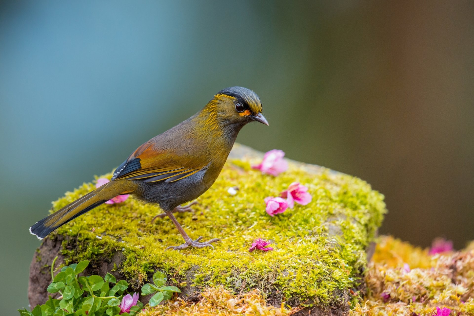 Schöner vogel auf dem hintergrund von blumen, gras und moosSchöner Vogel auf dem Hintergrund von Blumen, Gras und Moos