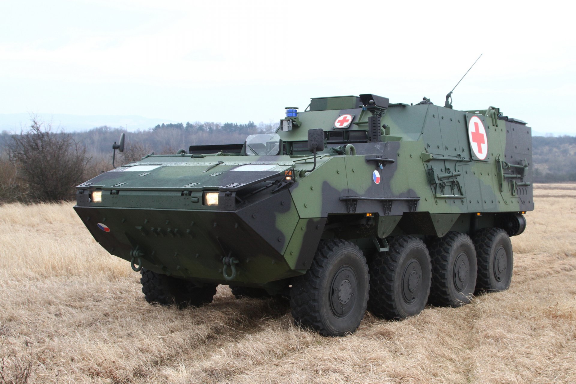 Auf dem Feld steht ein gepanzertes Sanitärevakuierungsfahrzeug