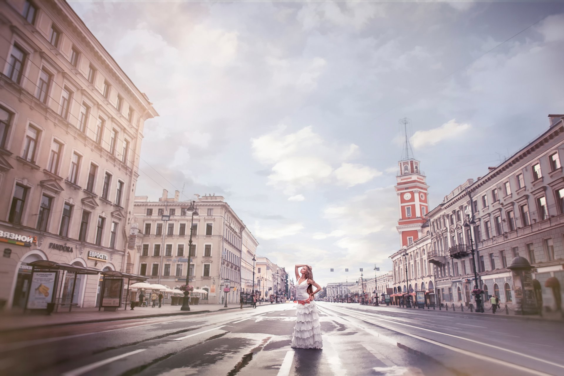 Braut im hochzeitskleid auf einer sandigen straße. um die blumen herumBraut im Hochzeitskleid auf einer sandigen Straße. Um die Blumen herum