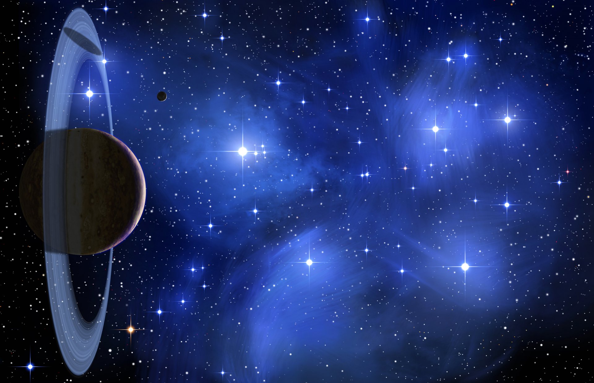 Ein planet mit ringen und einem leuchtenden stern ist der andere planetEin Planet mit Ringen und einem leuchtenden Stern ist der andere Planet