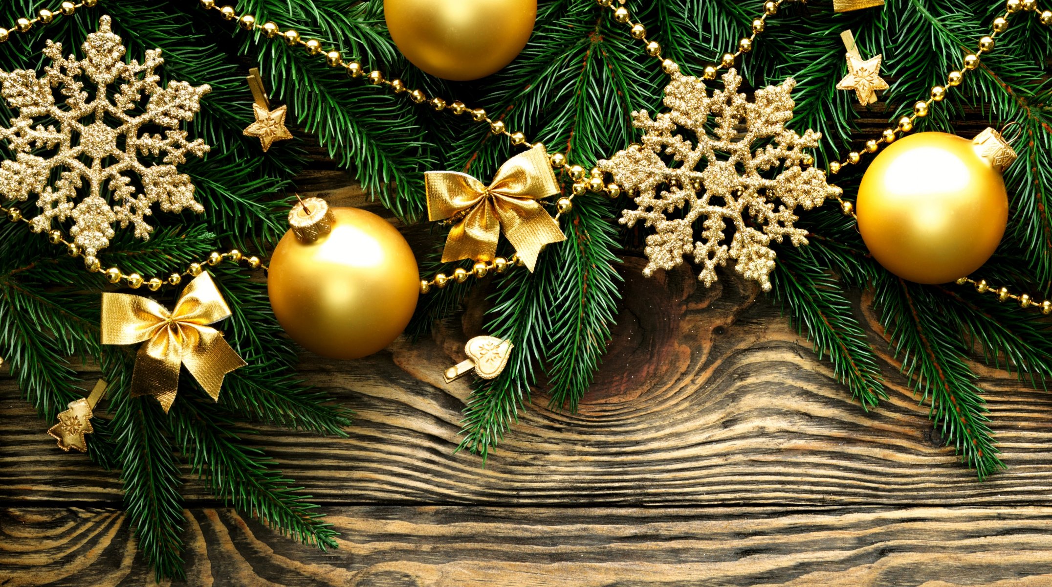 Goldene Schneeflocken, Kugeln und Bögen auf einem Tannenzweig