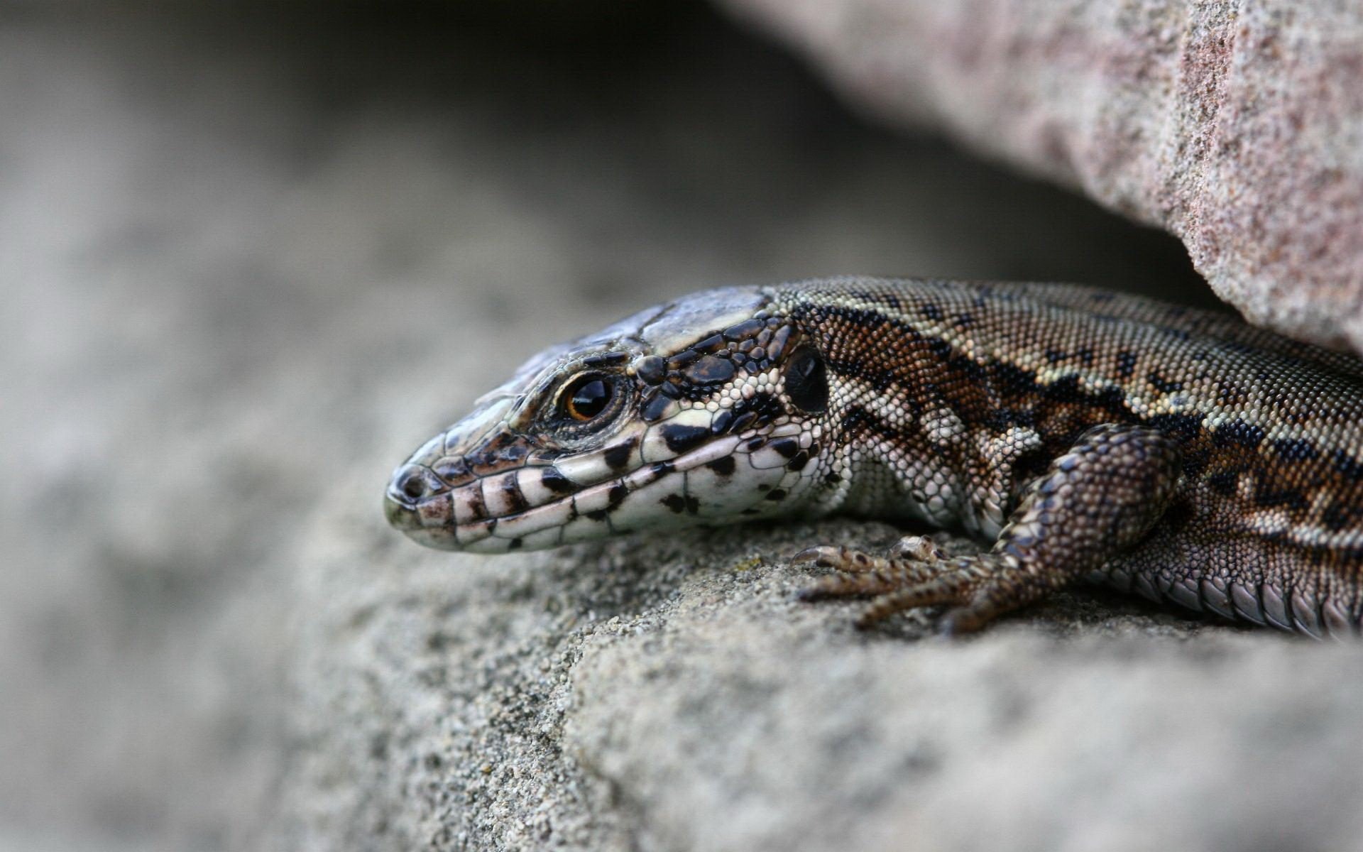 Eine Eidechse sitzt in einer Spalte unter einem Stein
