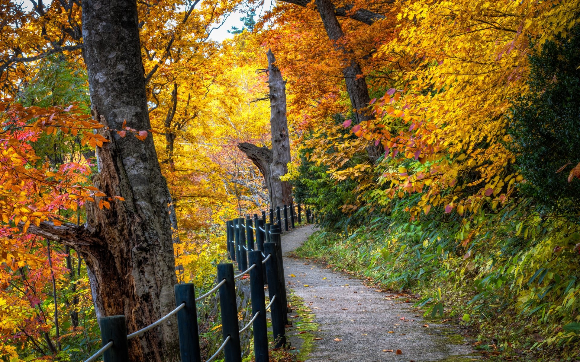 Gefallene gelbe ahornblätter an der nebligen straßeGefallene gelbe Ahornblätter an der nebligen Straße