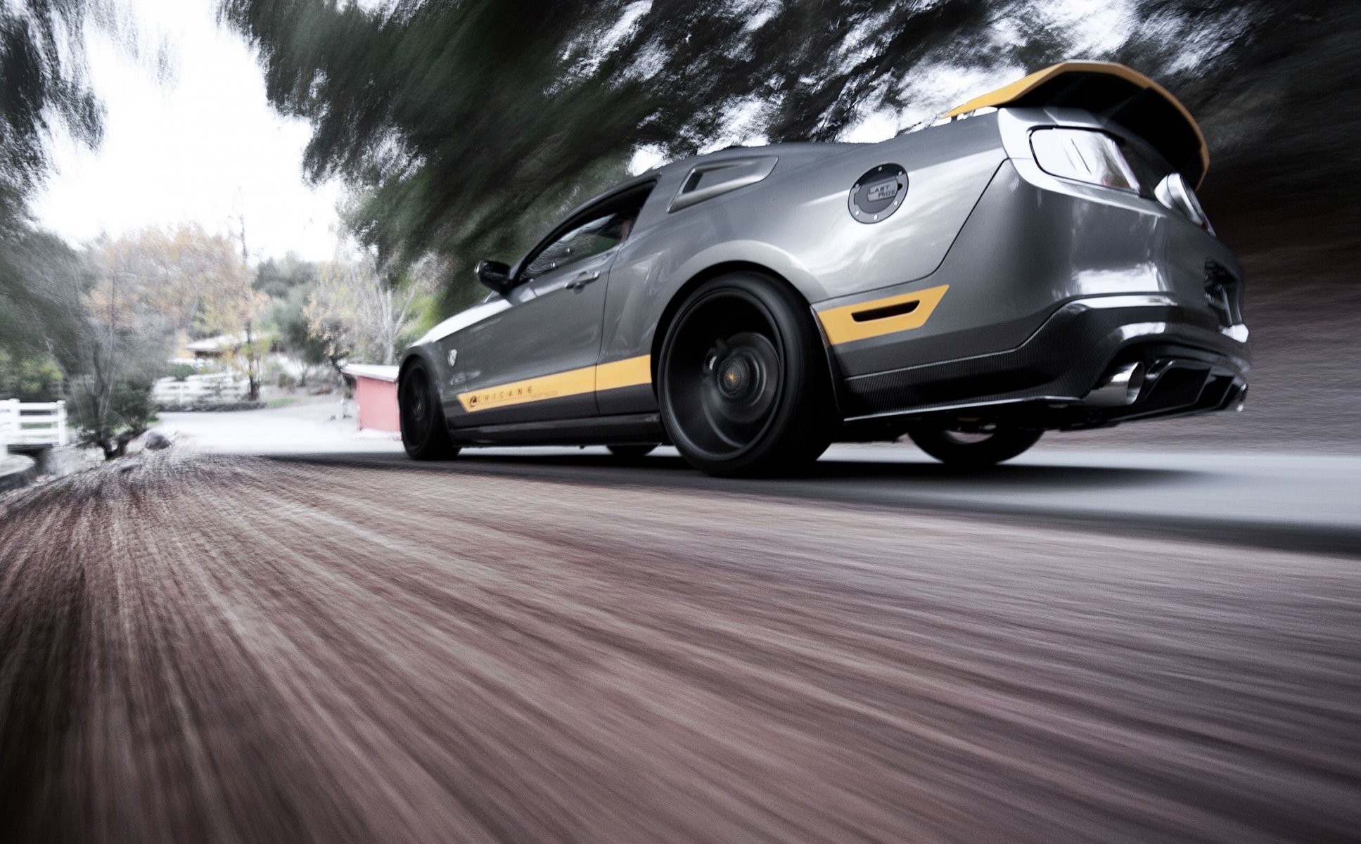 Ford Mustang in Grau rast mit Geschwindigkeit