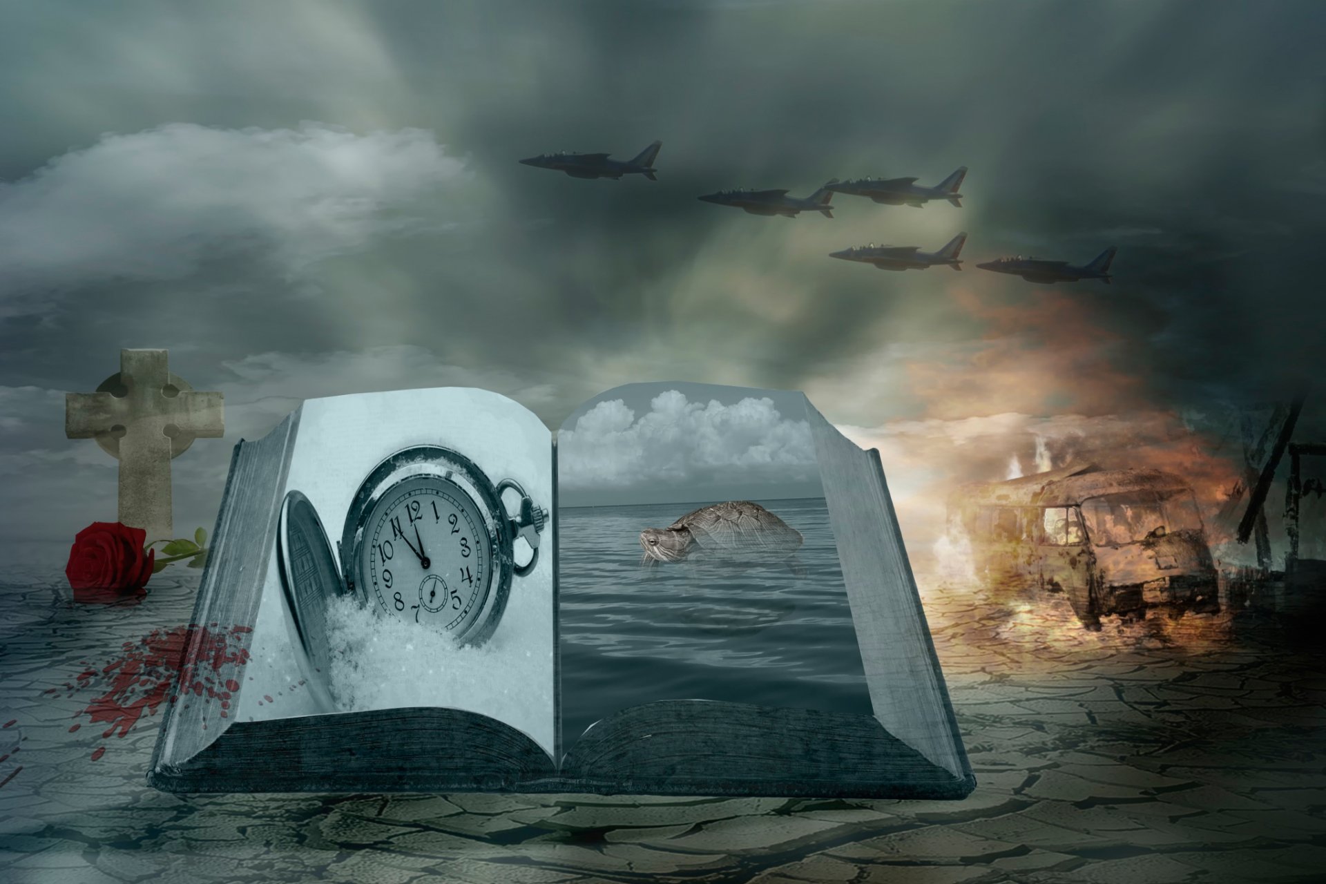 Ein vielschichtiges Gemälde mit einem Buch, einer Taschenuhr, einem Kreuz, einer roten Rose, einem brennenden Bus und einer Wasseroberfläche