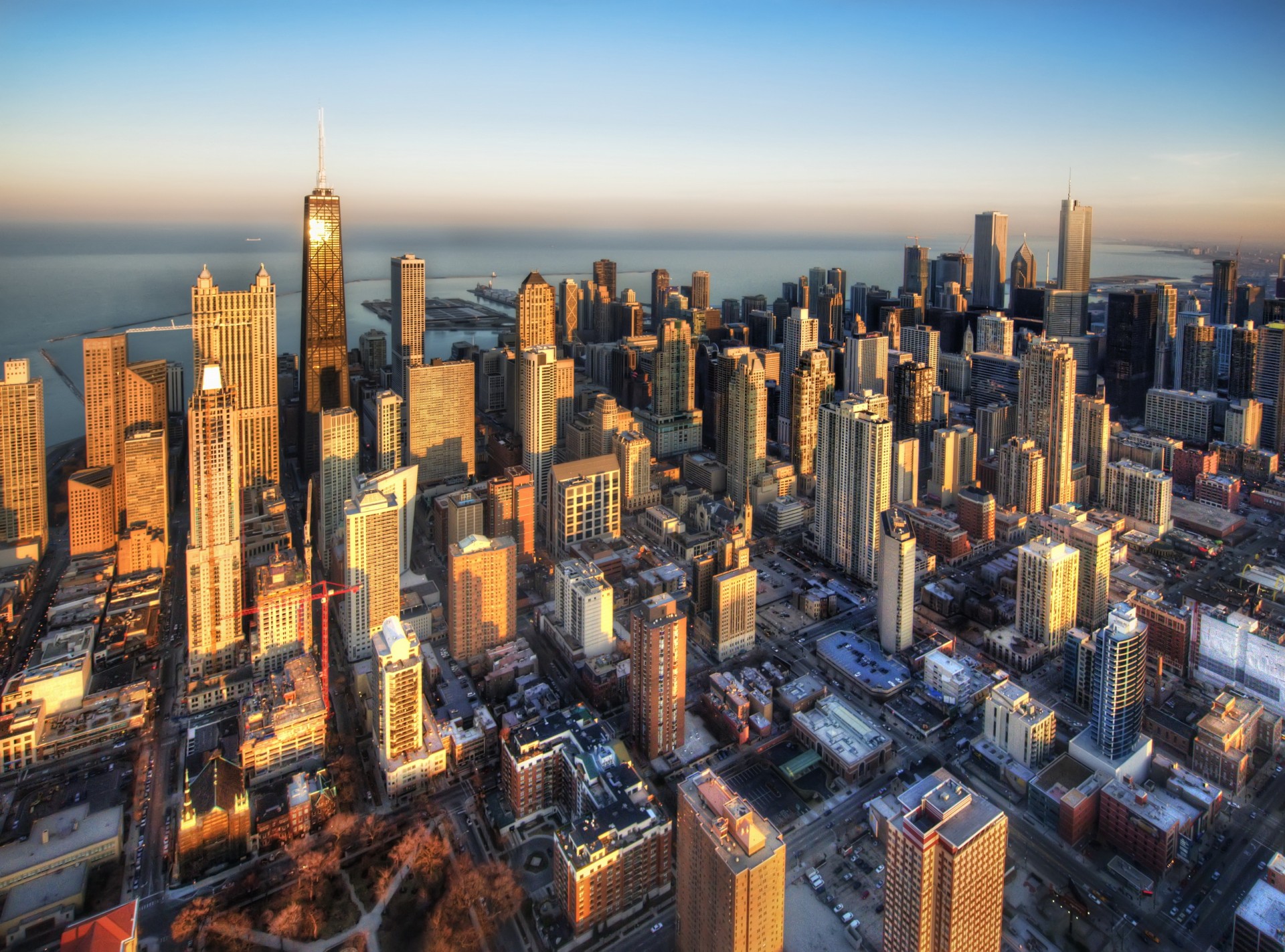 Die Stadt Chicago in den USA mit Hochhäusern am Fluss