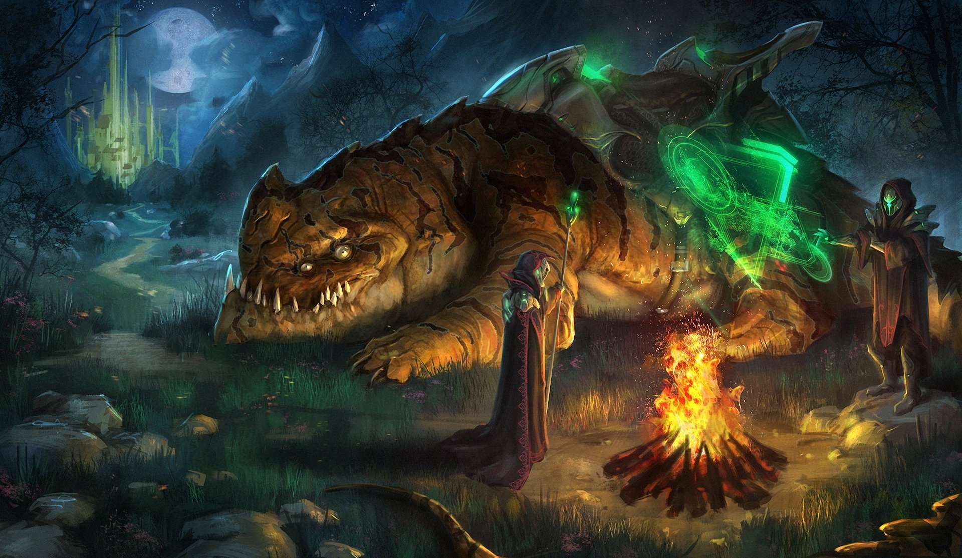 Ruinen einer höhle und ein monster auf einem felsenRuinen einer Höhle und ein Monster auf einem Felsen