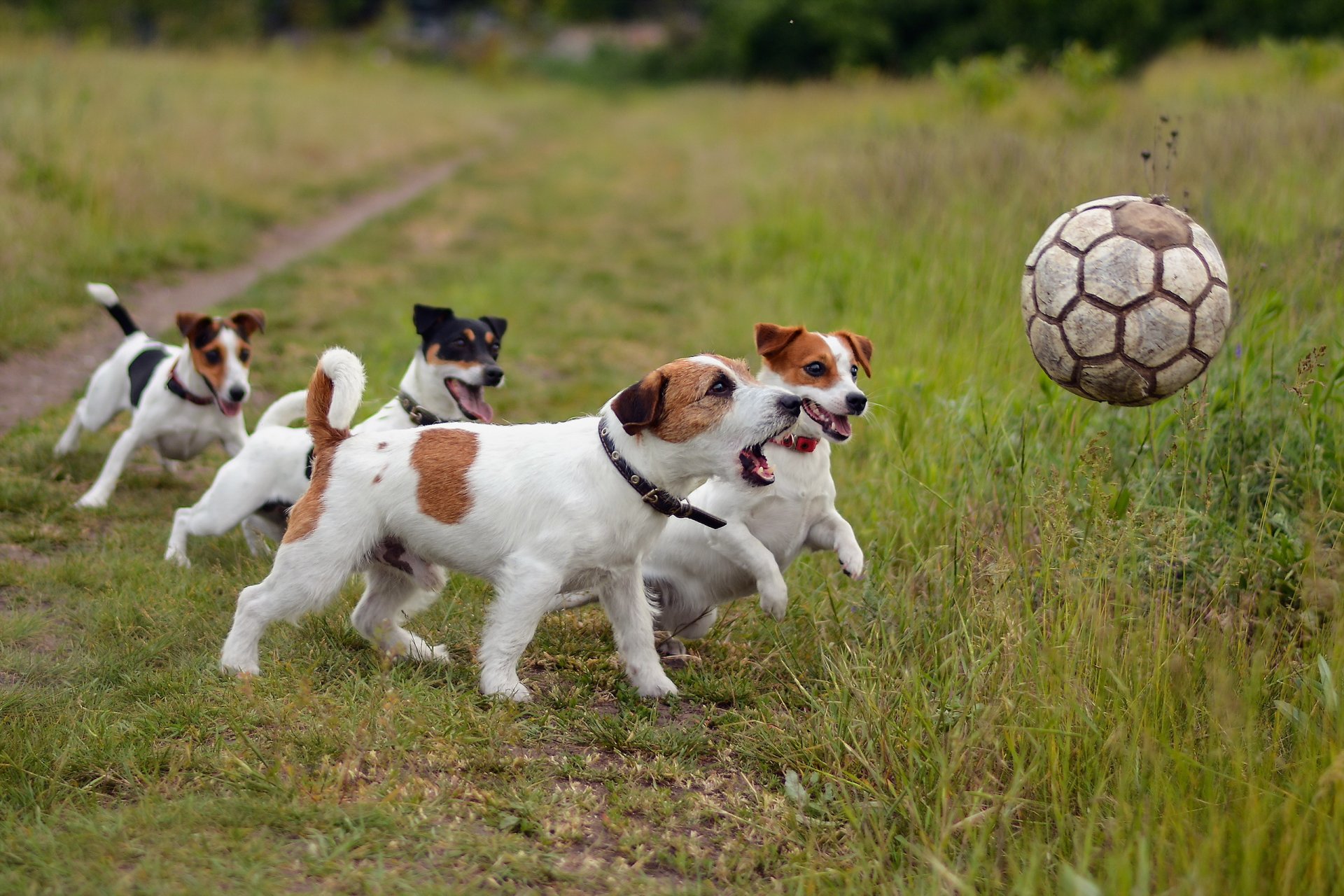 Redhead Welpe spielt mit einem Ball auf dem Rasen
