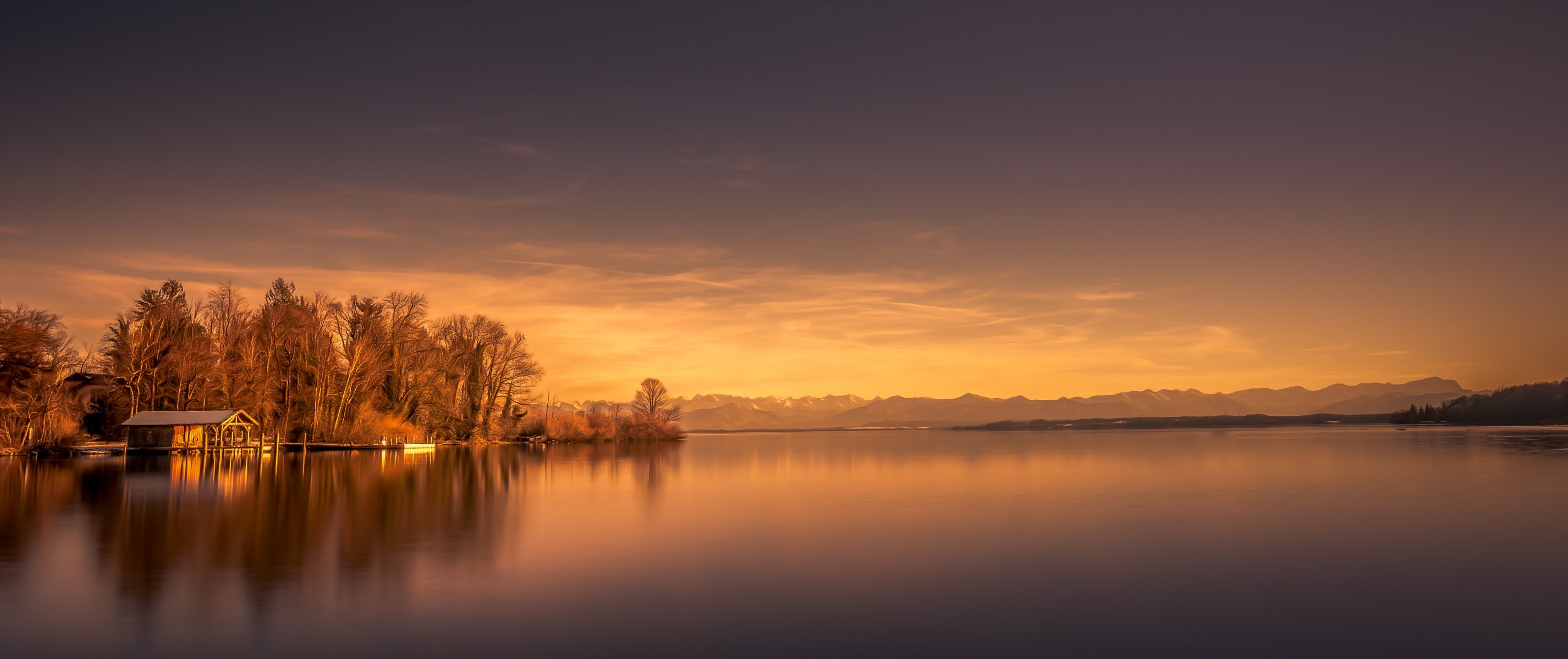 Die letzten sonnenstrahlen des vergangenen tages erhellten das haus am seeuferDie letzten Sonnenstrahlen des vergangenen Tages erhellten das Haus am Seeufer