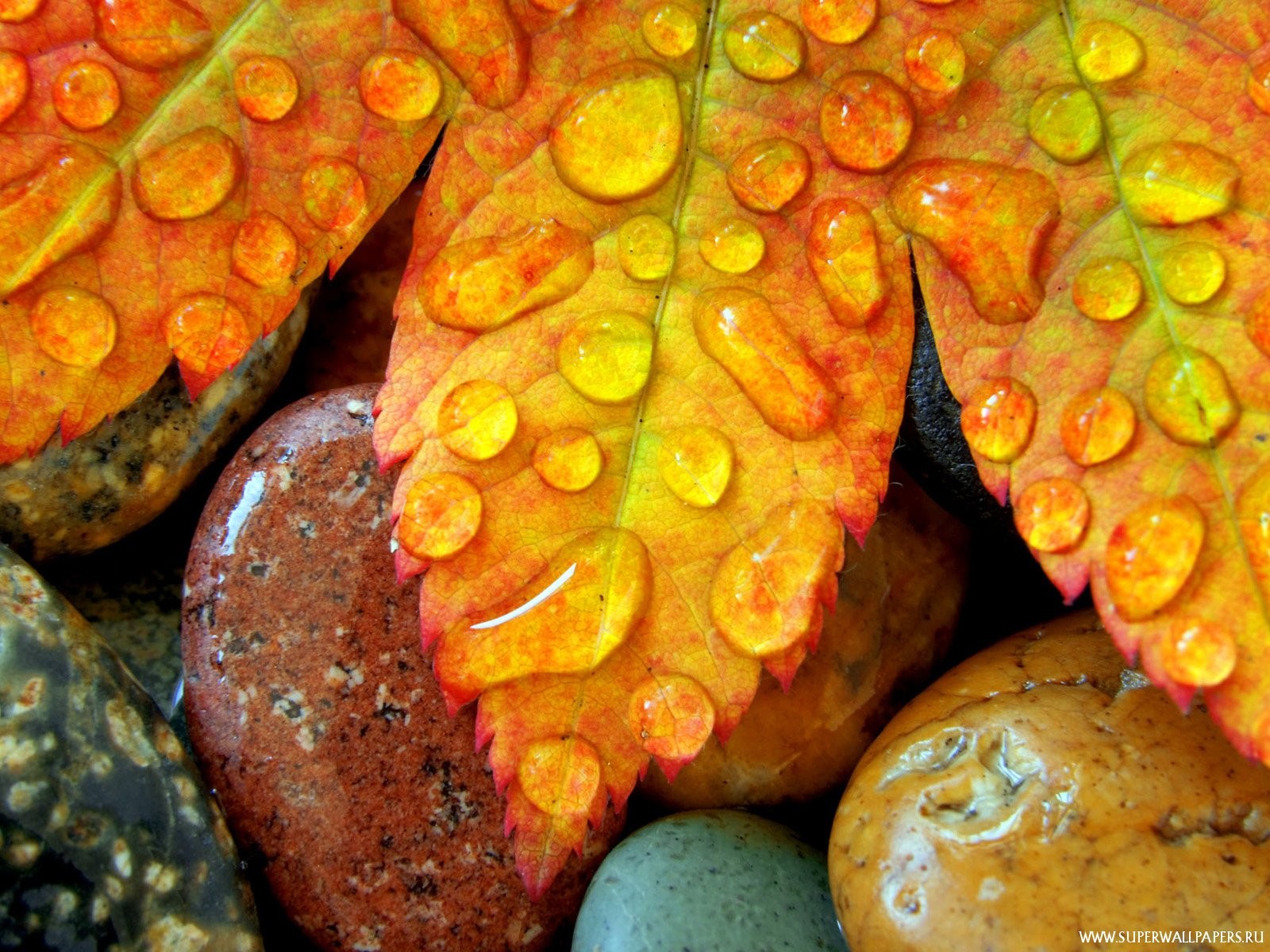 Tau auf einem gelben blatt, das auf die steine fielTau auf einem gelben Blatt, das auf die Steine fiel
