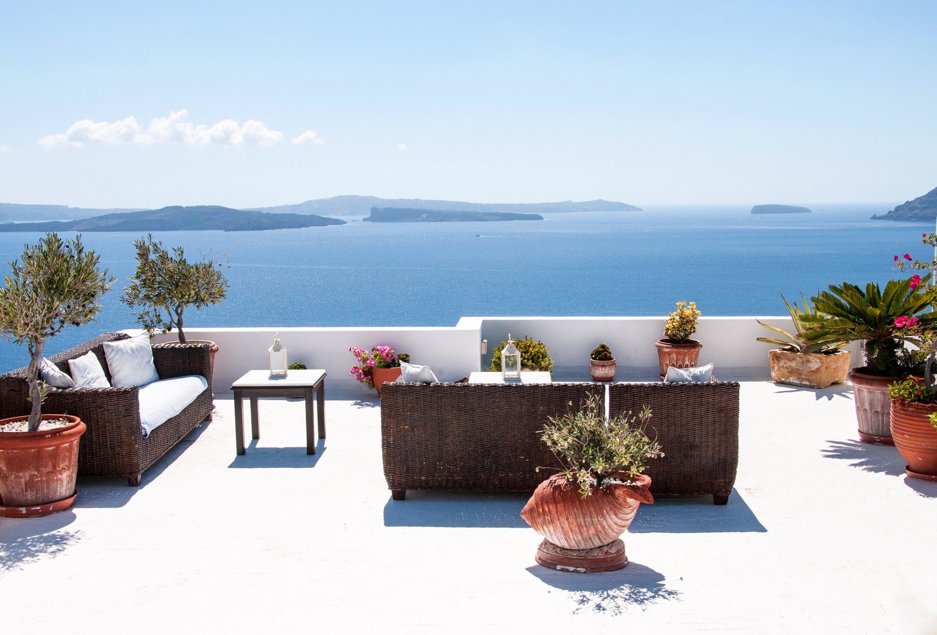 Die Sonne scheint durch die Wolken und das ruhige blaue Meer