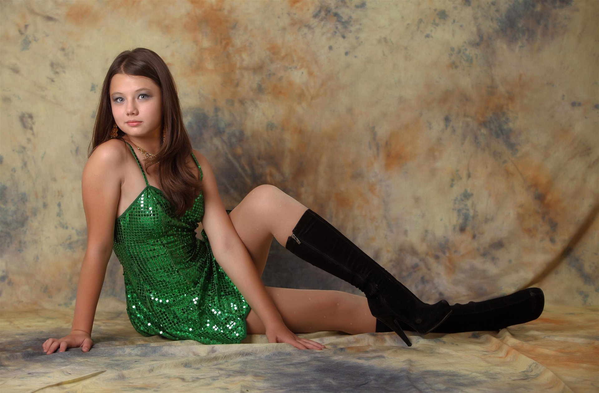 Langhaarige Mädchen in einem grünen Kleid und schwarzen Stiefeln
