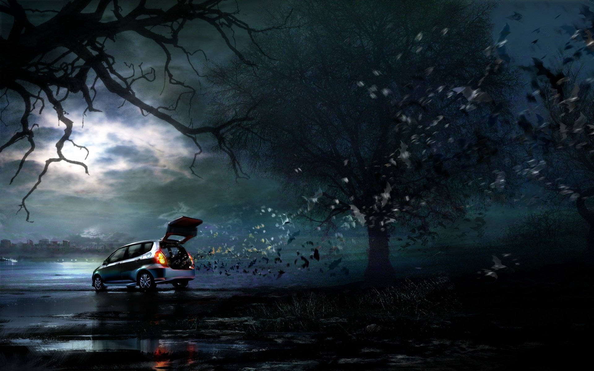 Ein finsteres Auto, das Fledermäuse aus dem Kofferraum befreit