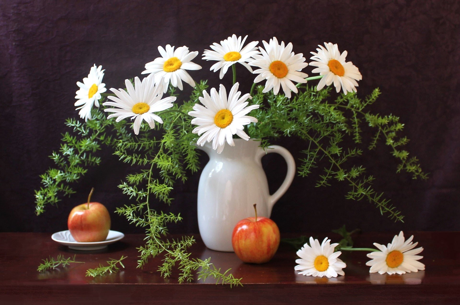 Stillleben bestehend aus einem Krug, Äpfeln und Gänseblümchen
