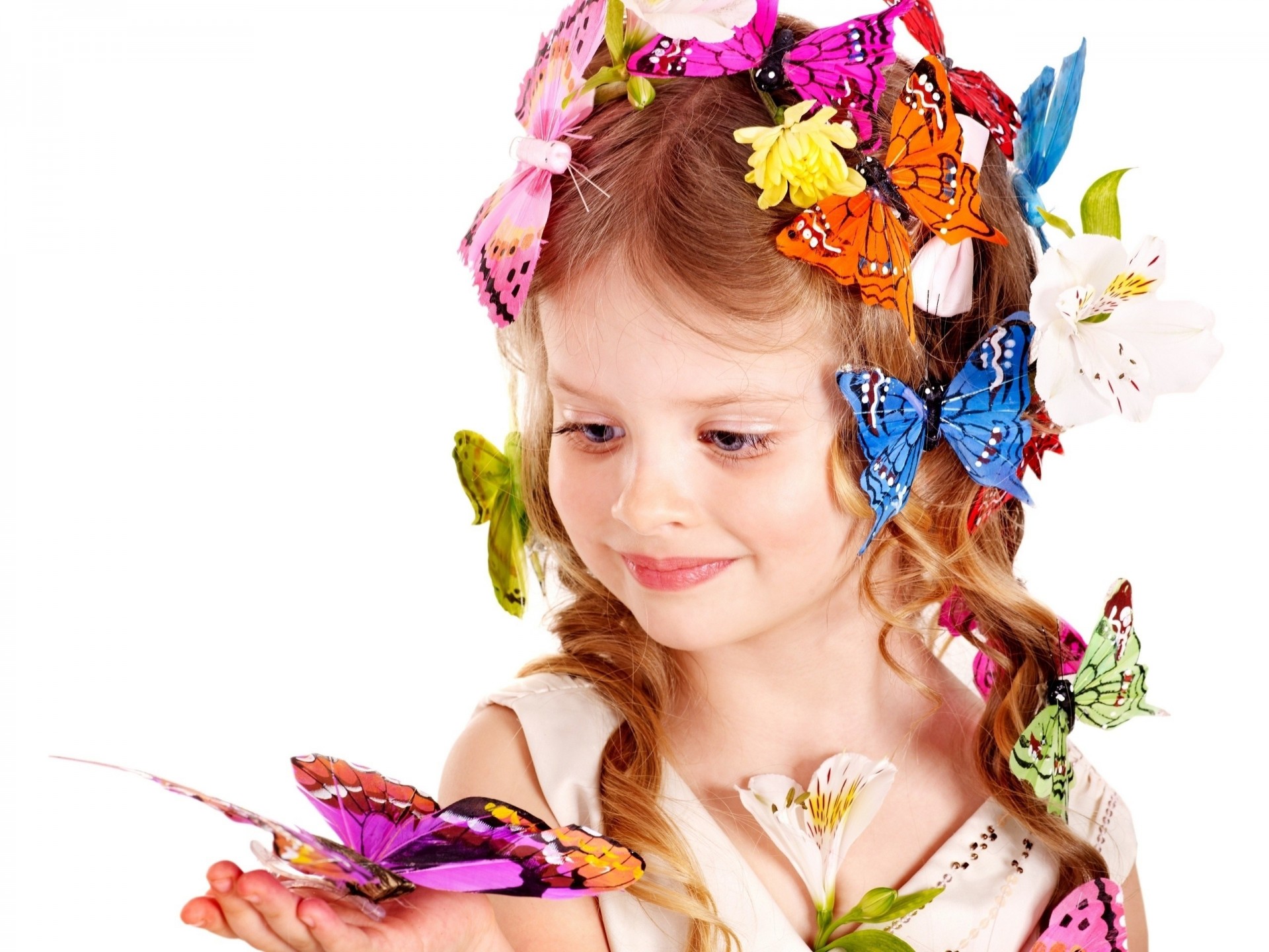 Ein mädchen mit einer blume hält einen schmetterling in der handEin Mädchen mit einer Blume hält einen Schmetterling in der Hand