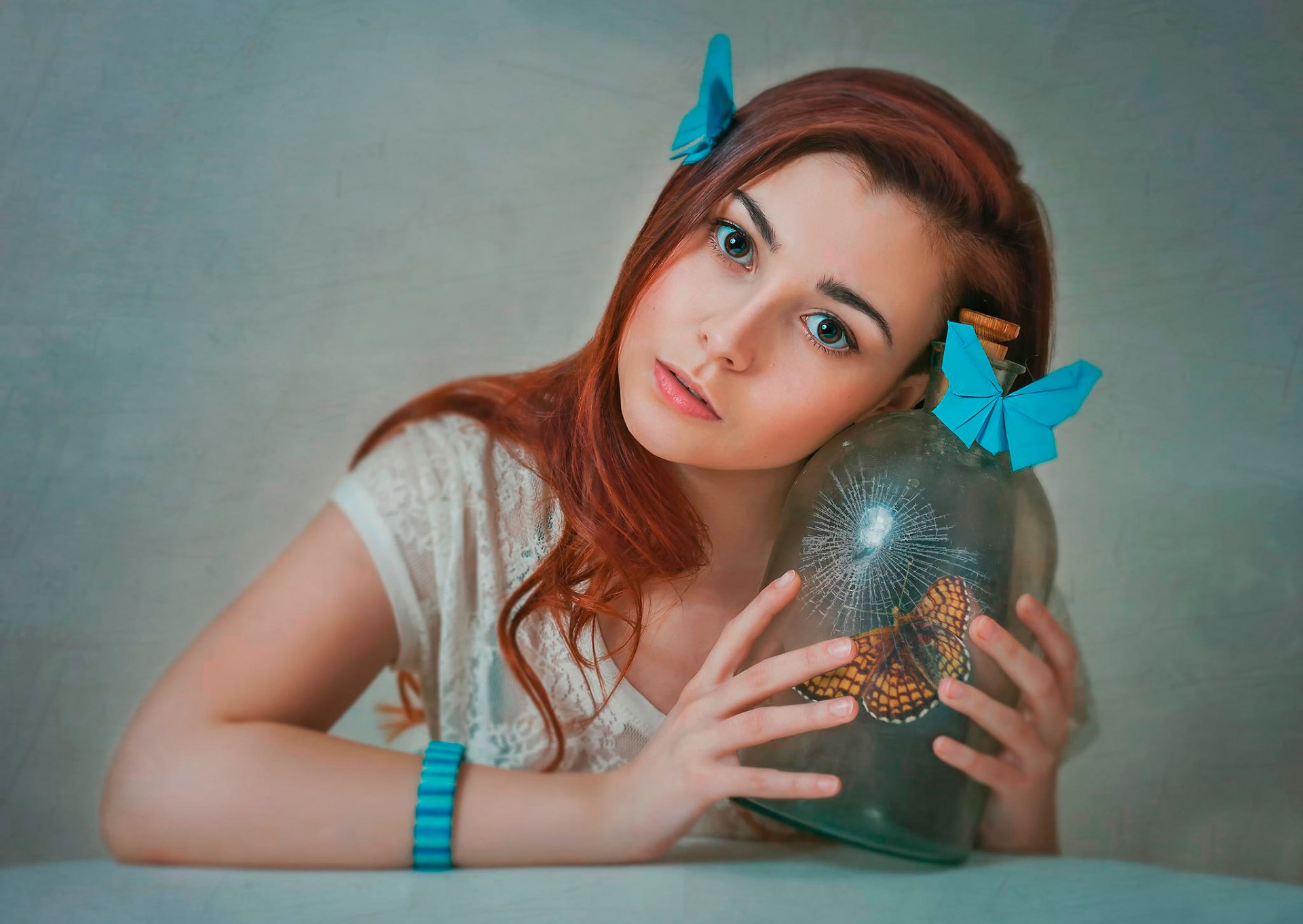 Porträt eines rothaarigen Mädchens mit Schmetterlingen