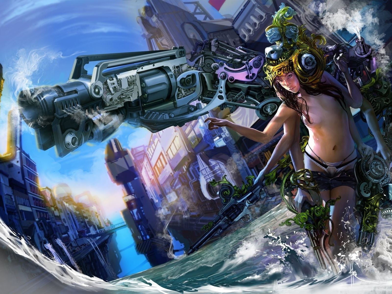 Ein Mädchen aus der Fiktion mit einer Kanone in den Händen