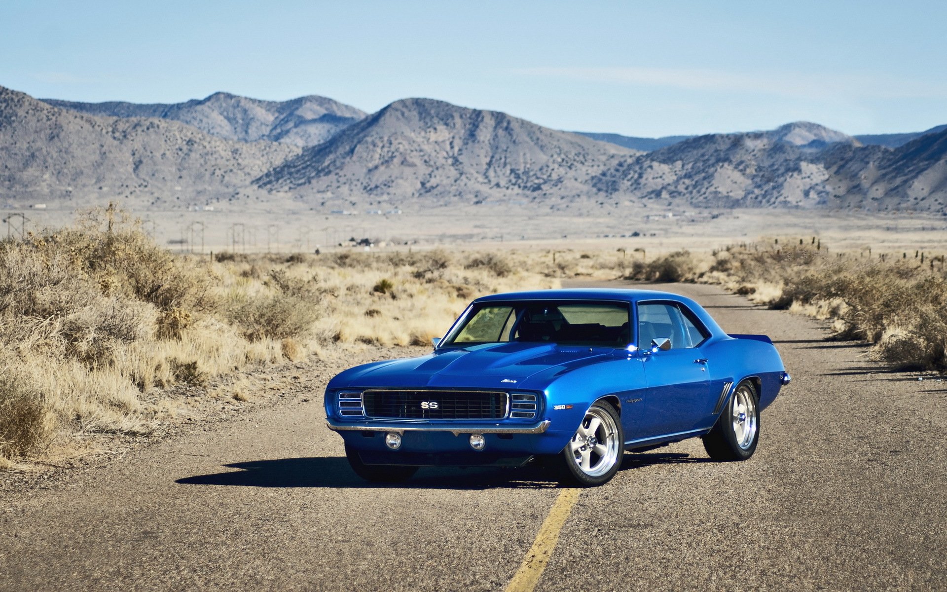 Blauer chevrolet auf der straße vor dem hintergrund der bergeBlauer Chevrolet auf der Straße vor dem Hintergrund der Berge