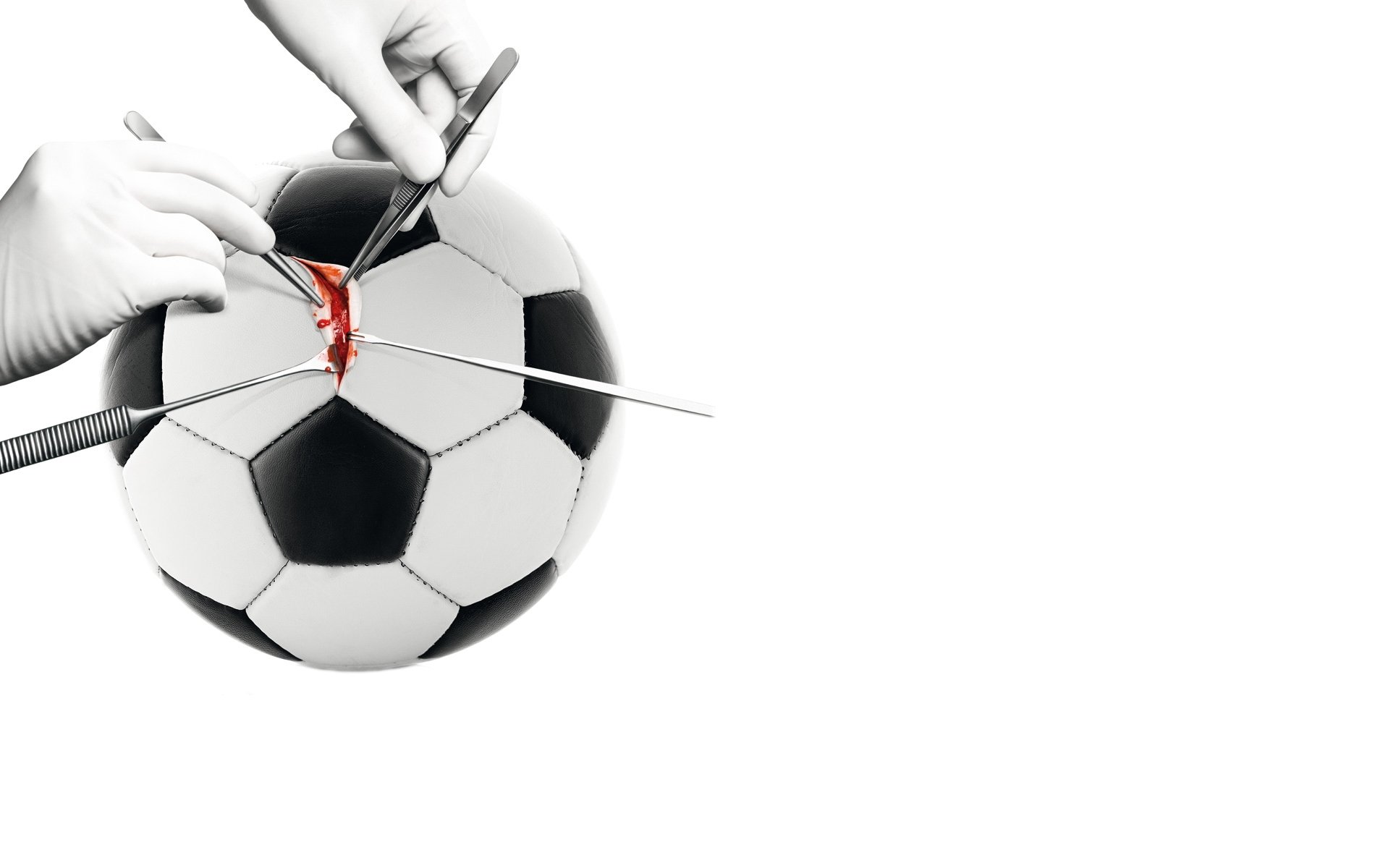 Der ball wird mit einem werkzeug geschnitten. handschuheDer Ball wird mit einem Werkzeug geschnitten. Handschuhe