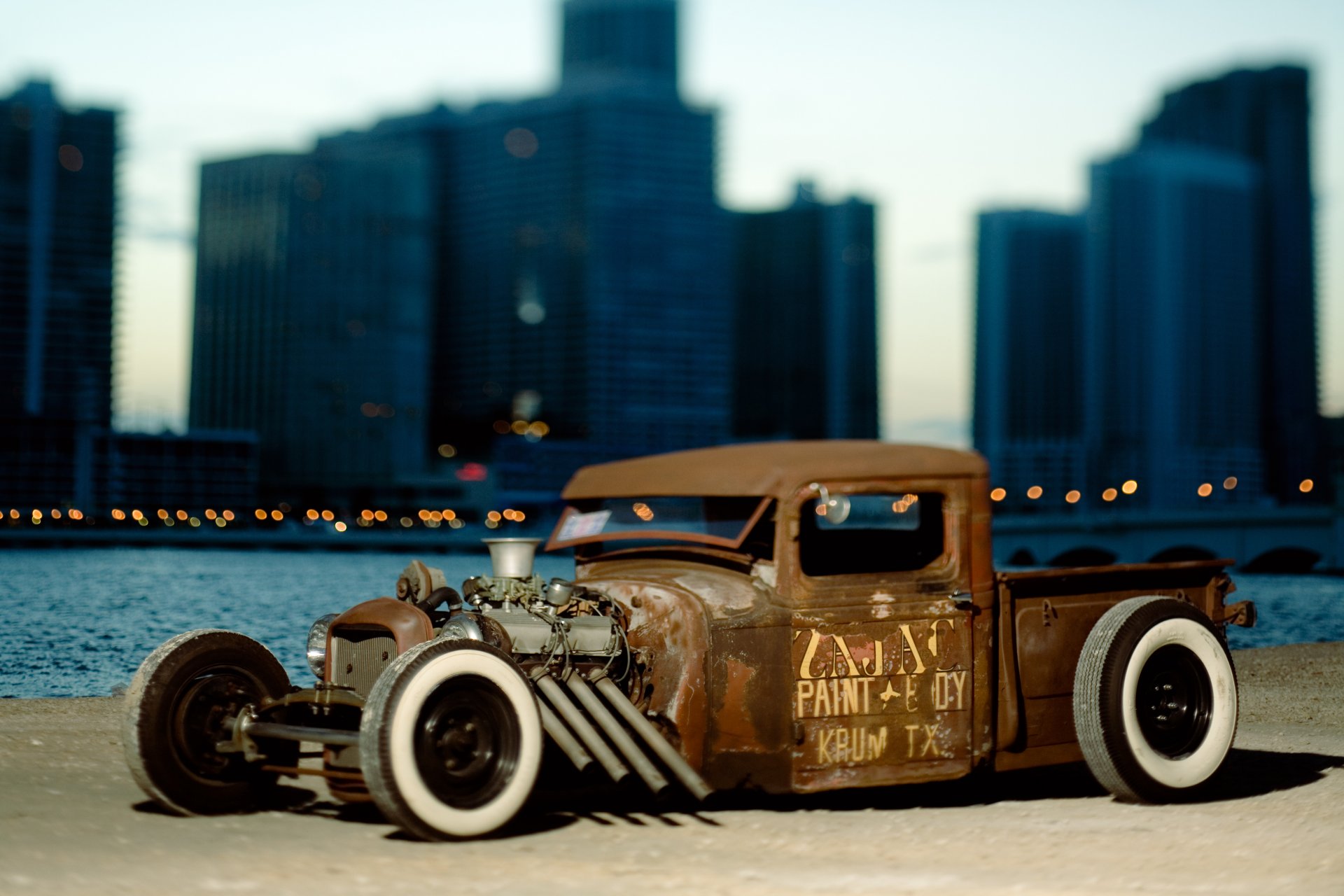 Ein schwarzes Auto mit Inschriften steht in der Nähe der Schiene
