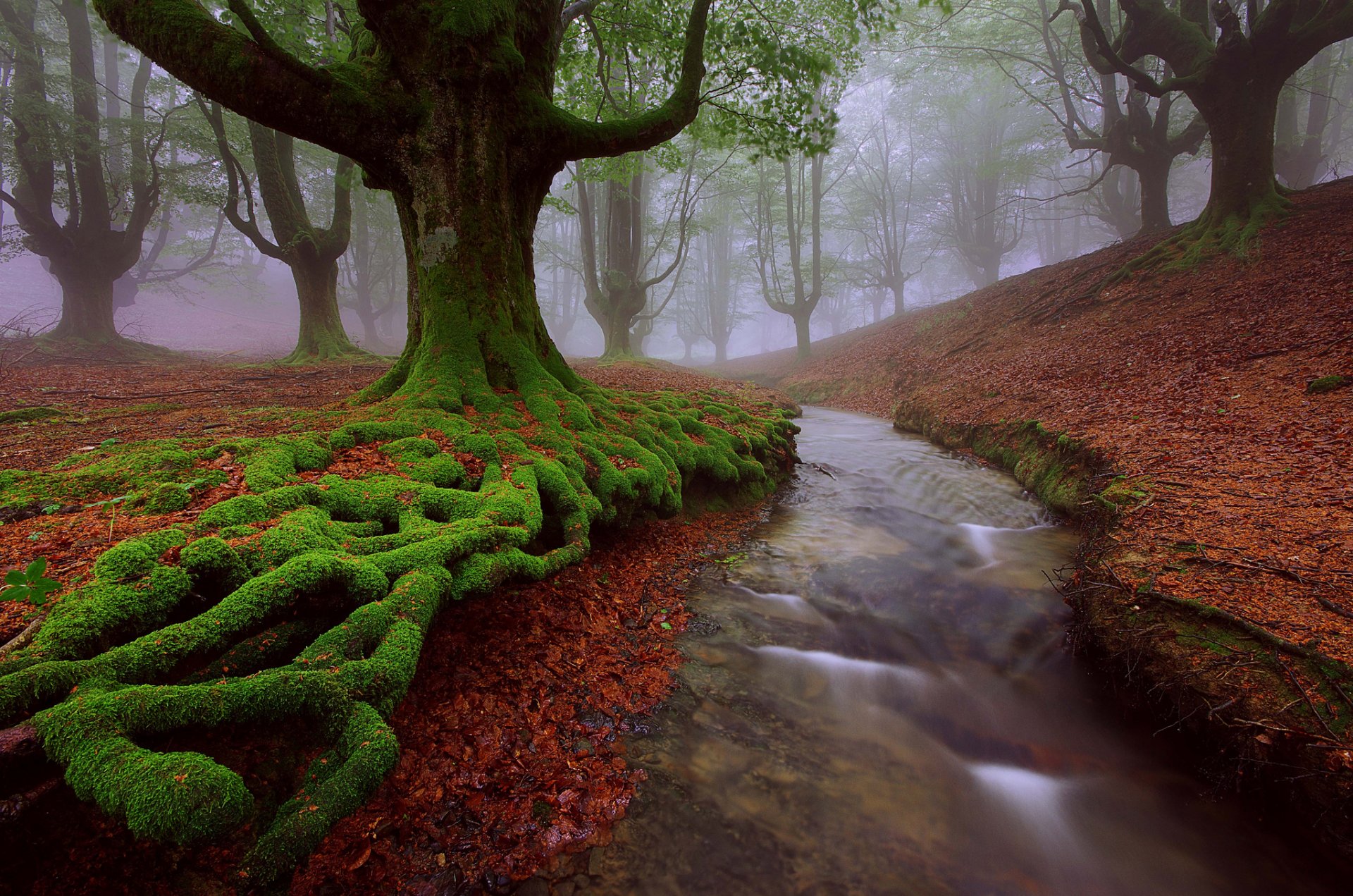 Ungewöhnliche Herbstfarben in der Reflexion des Wassers vor dem Hintergrund der Straße dichter Wälder und des weiß-blauen Himmels