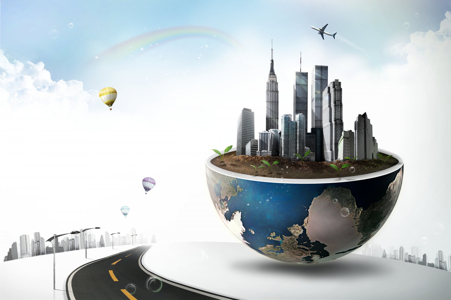 Ein planet mit wolkenkratzern und der weg zu den ballonsEin Planet mit Wolkenkratzern und der Weg zu den Ballons