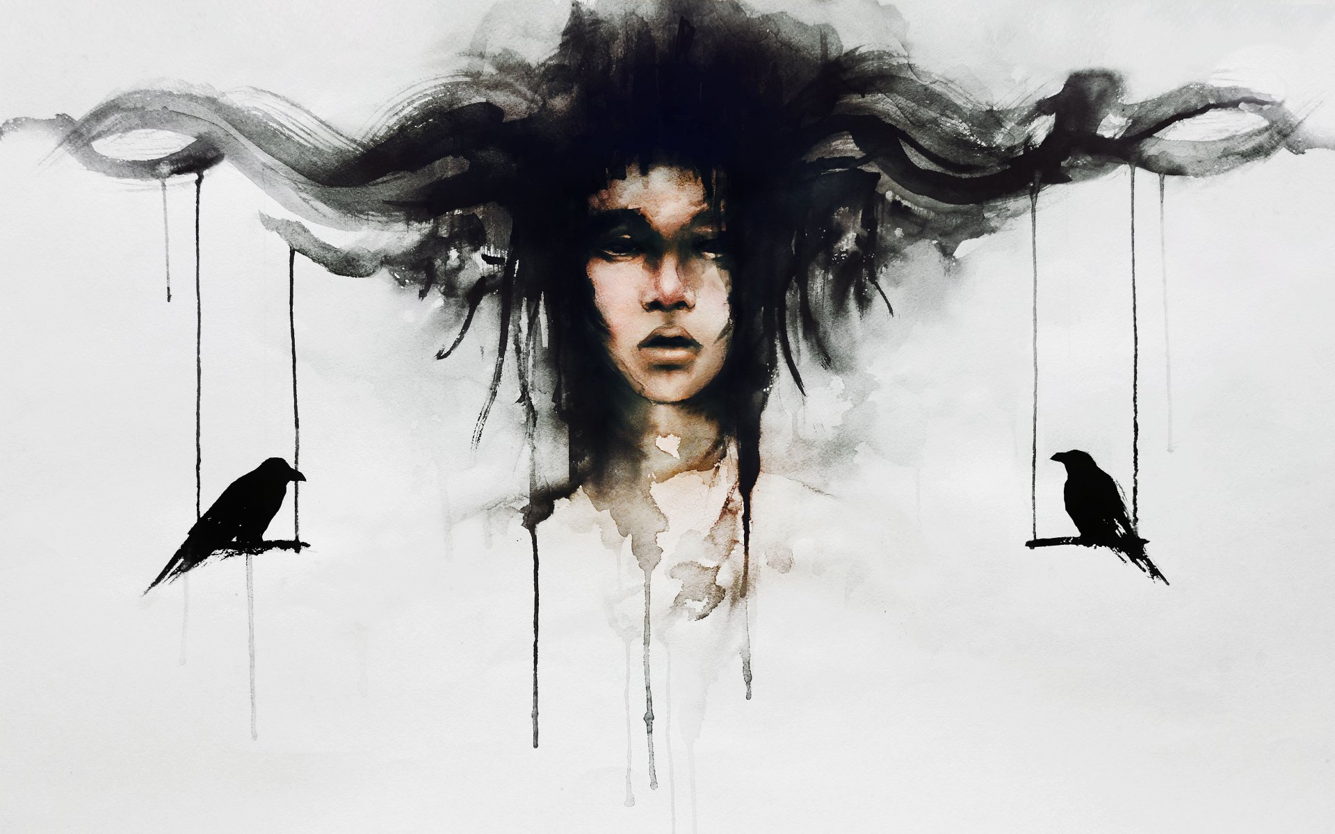 Porträt eines mädchens mit schwarzen haaren in form von schaukeln und krähen, die darauf sitzenPorträt eines Mädchens mit schwarzen Haaren in Form von Schaukeln und Krähen, die darauf sitzen