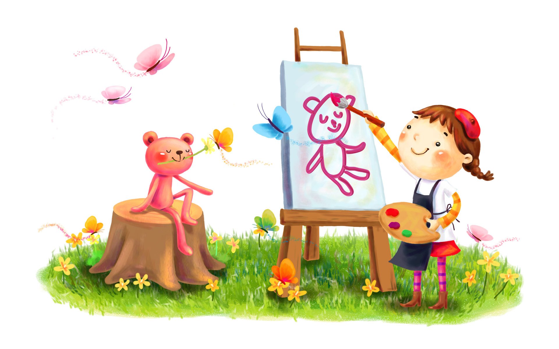 Auf dem rasen im sommer malt ein mädchen mit farben auf leinwandAuf dem Rasen im Sommer malt ein Mädchen mit Farben auf Leinwand