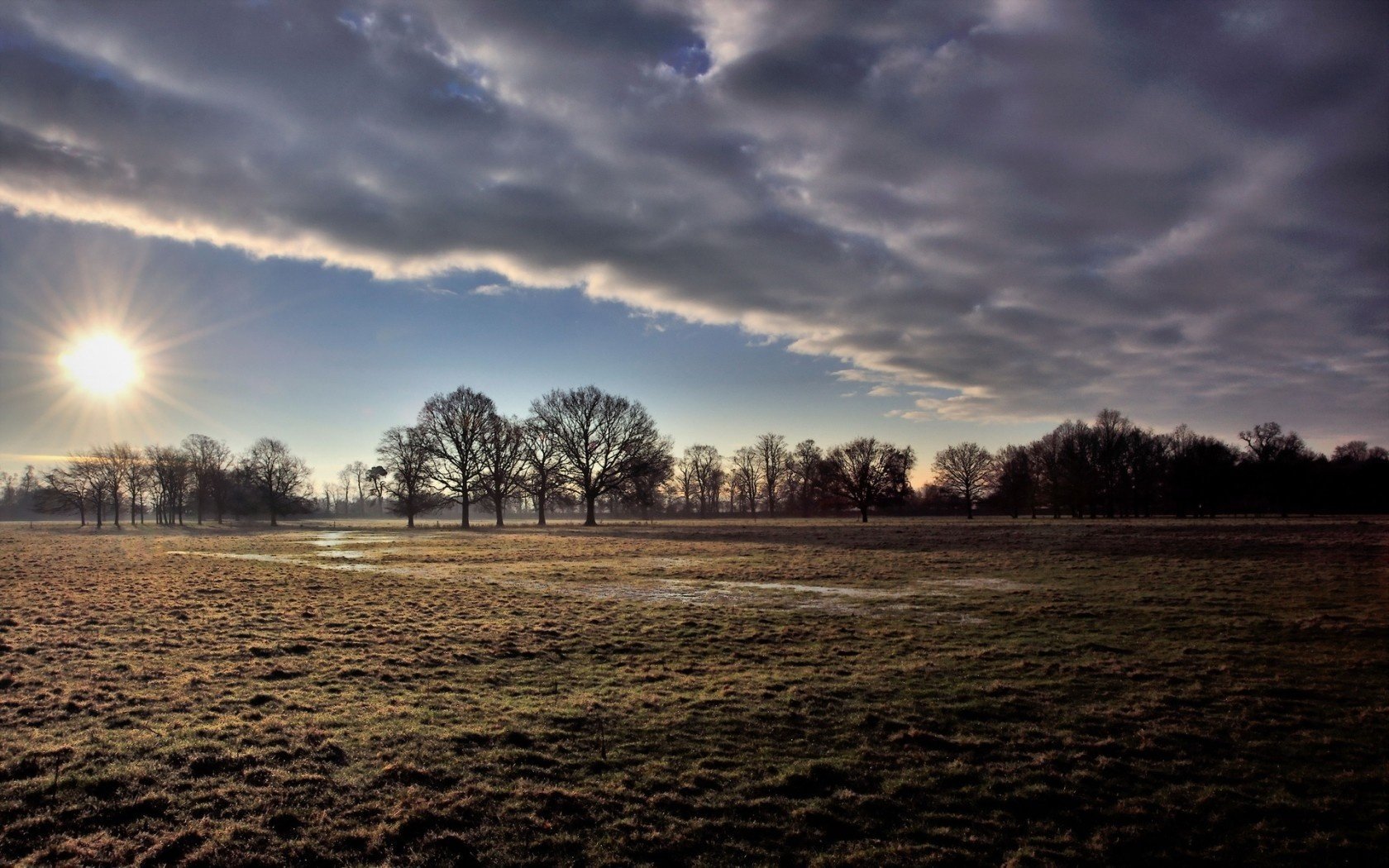 Die Sonne und die Bäume spiegeln sich im Fluss wider