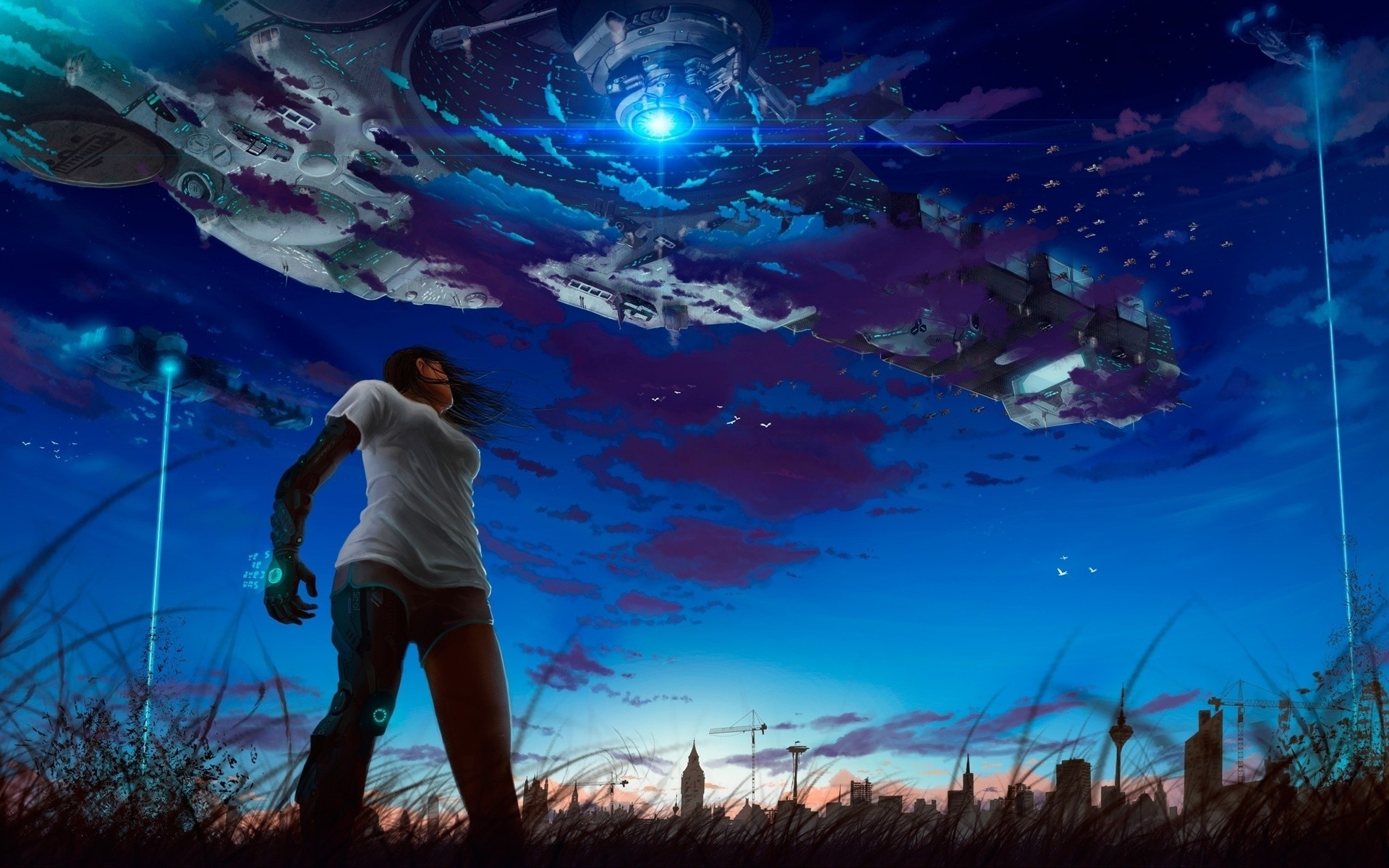 Die Nacht. Ein Roboter und ein Mädchen auf einem Schiff
