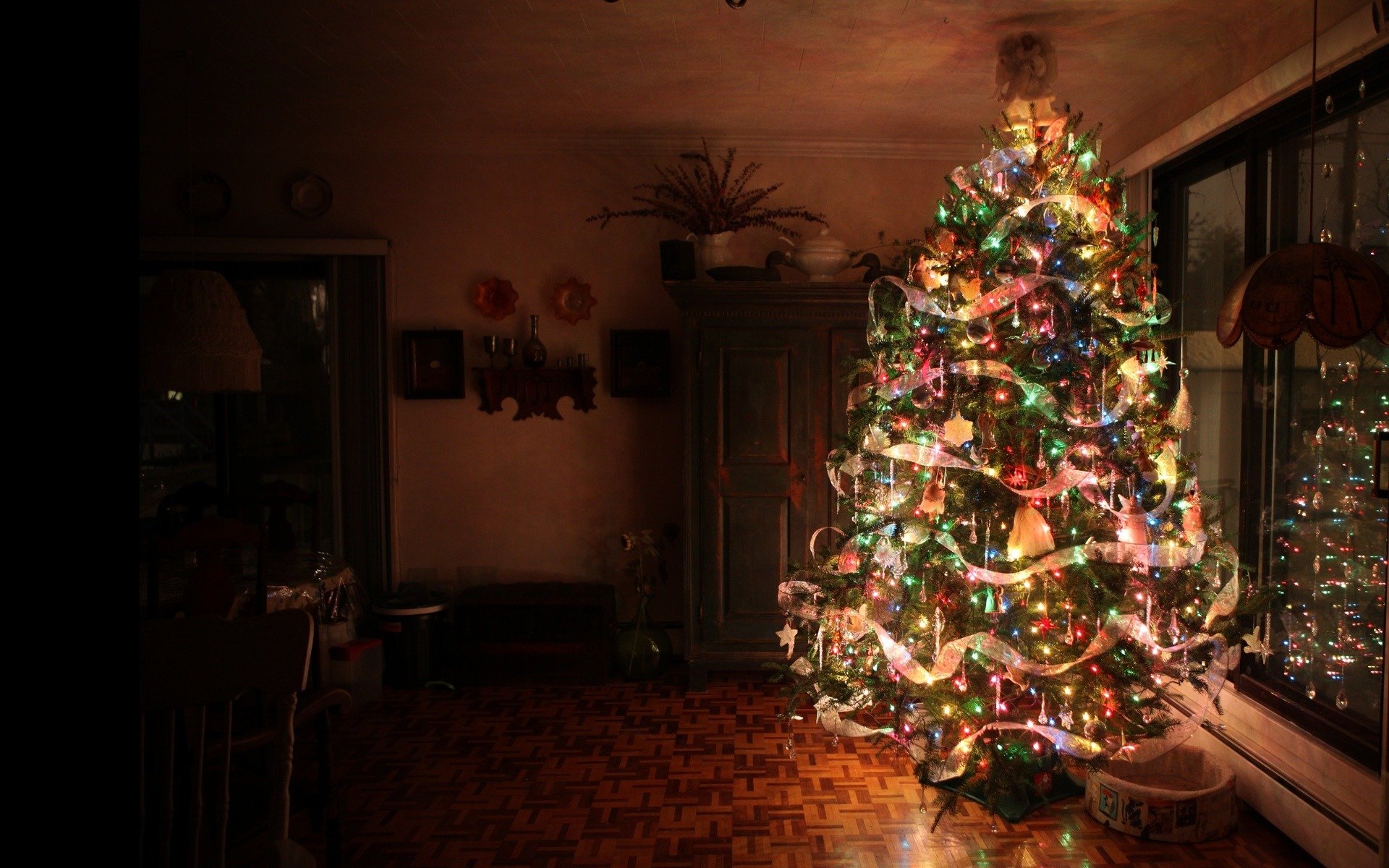 Die Nacht. Weihnachtsbaum mit glühenden Girlanden in der Wohnung