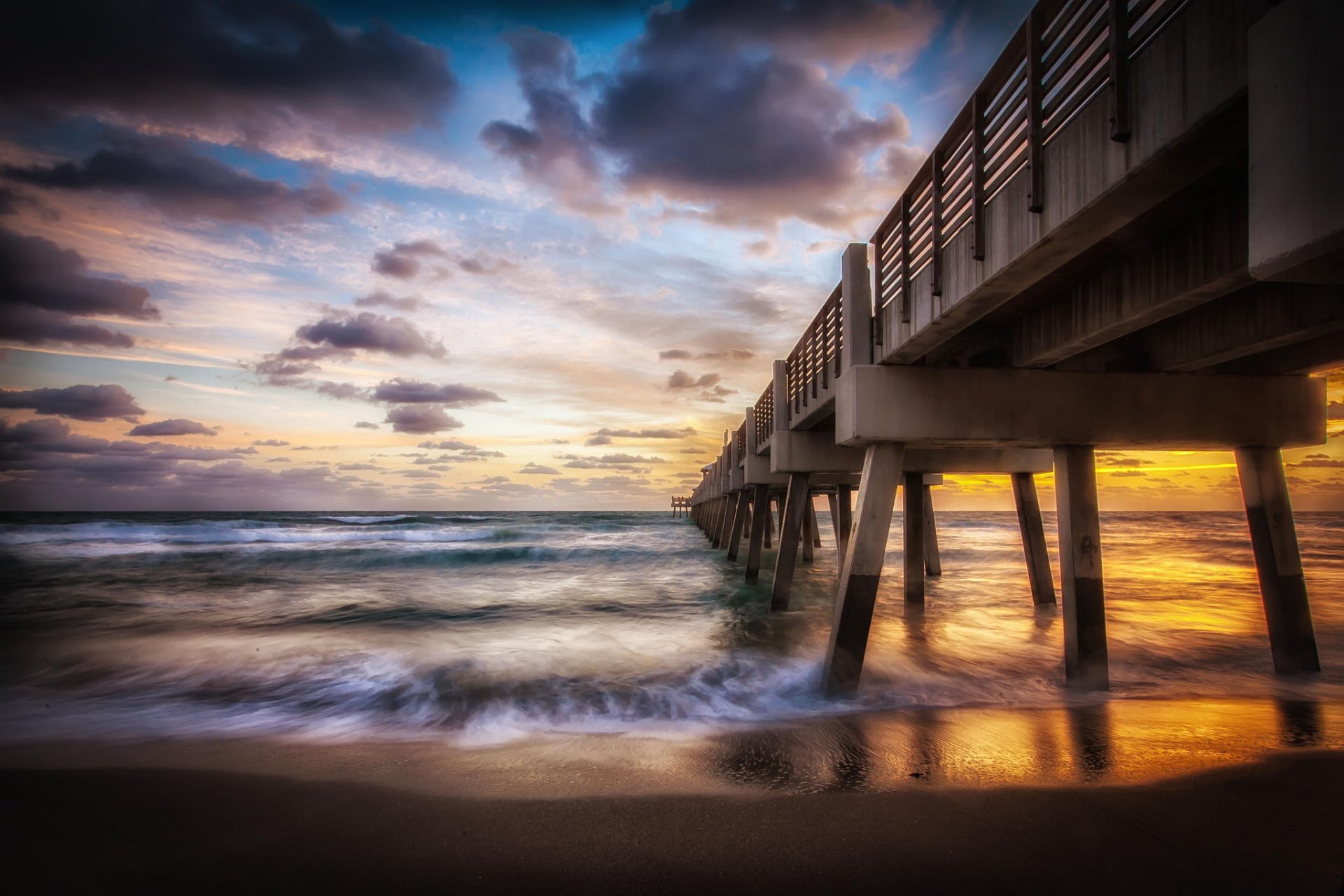 Die Sonne verbirgt sich hinter dem Horizont und spiegelt sich in den Wellen auf dem Wasser wider