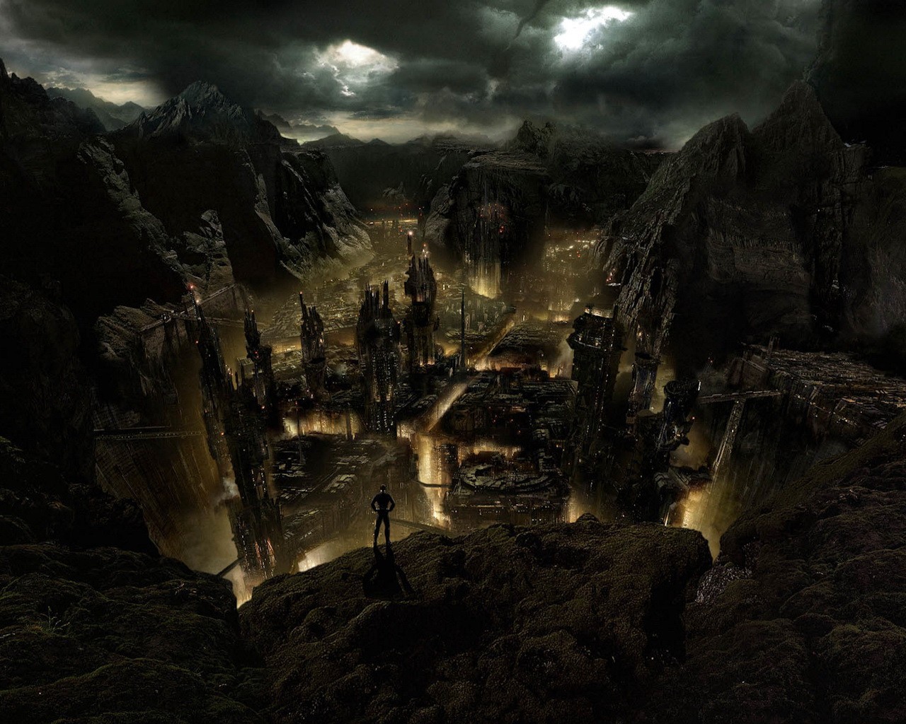 Eine Stadt schwebt über der Dunkelheit, die sich in den Felsen versteckt