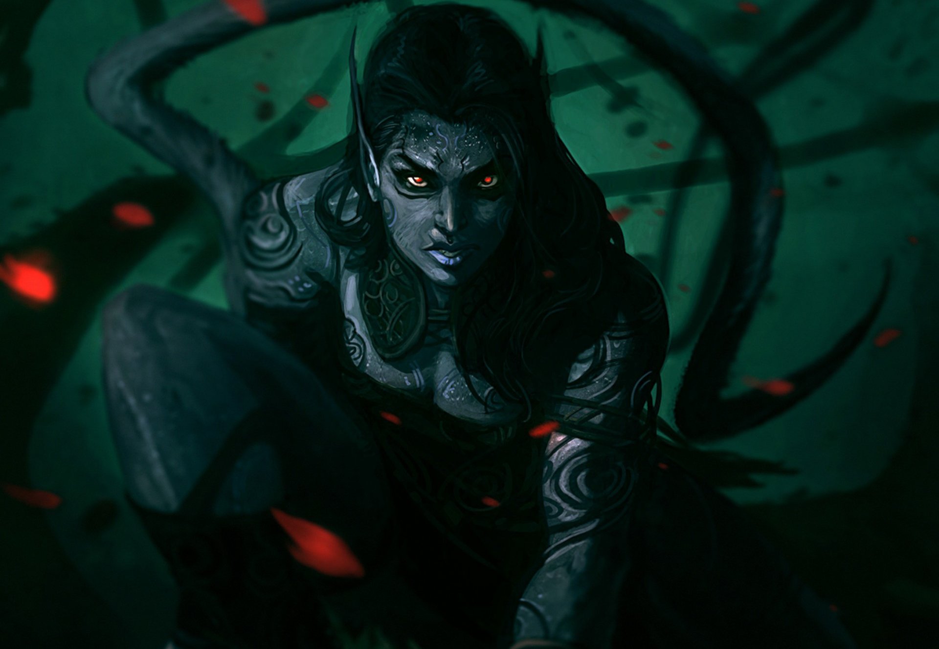 Fantasy-Kunst-Mädchen mit Tattoos, scharfen Ohren und roten Augen