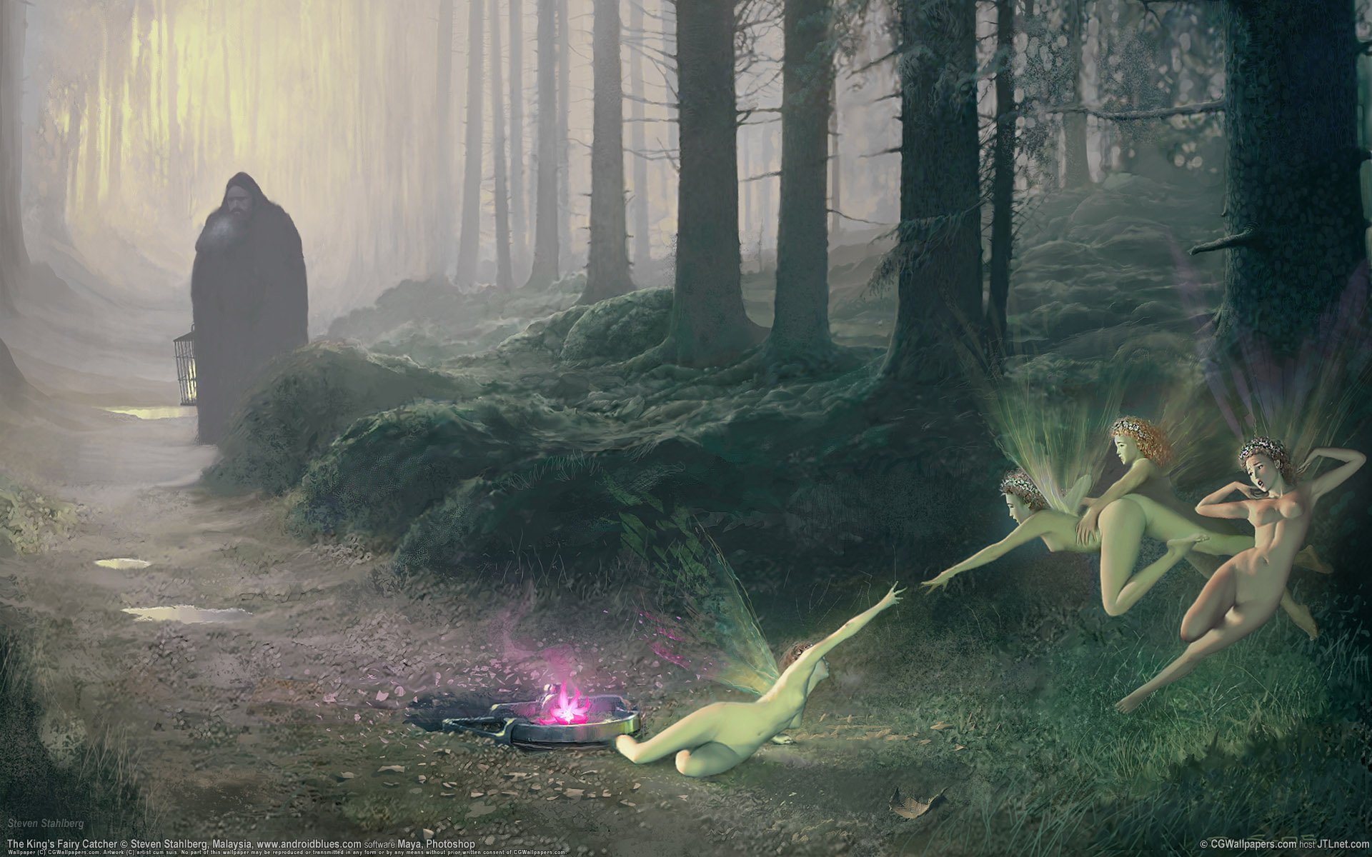 Foto im fantasy-stil. feen sind in eine falle geraten, der jäger beobachtet von außenFoto im Fantasy-Stil. Feen sind in eine Falle geraten, der Jäger beobachtet von außen