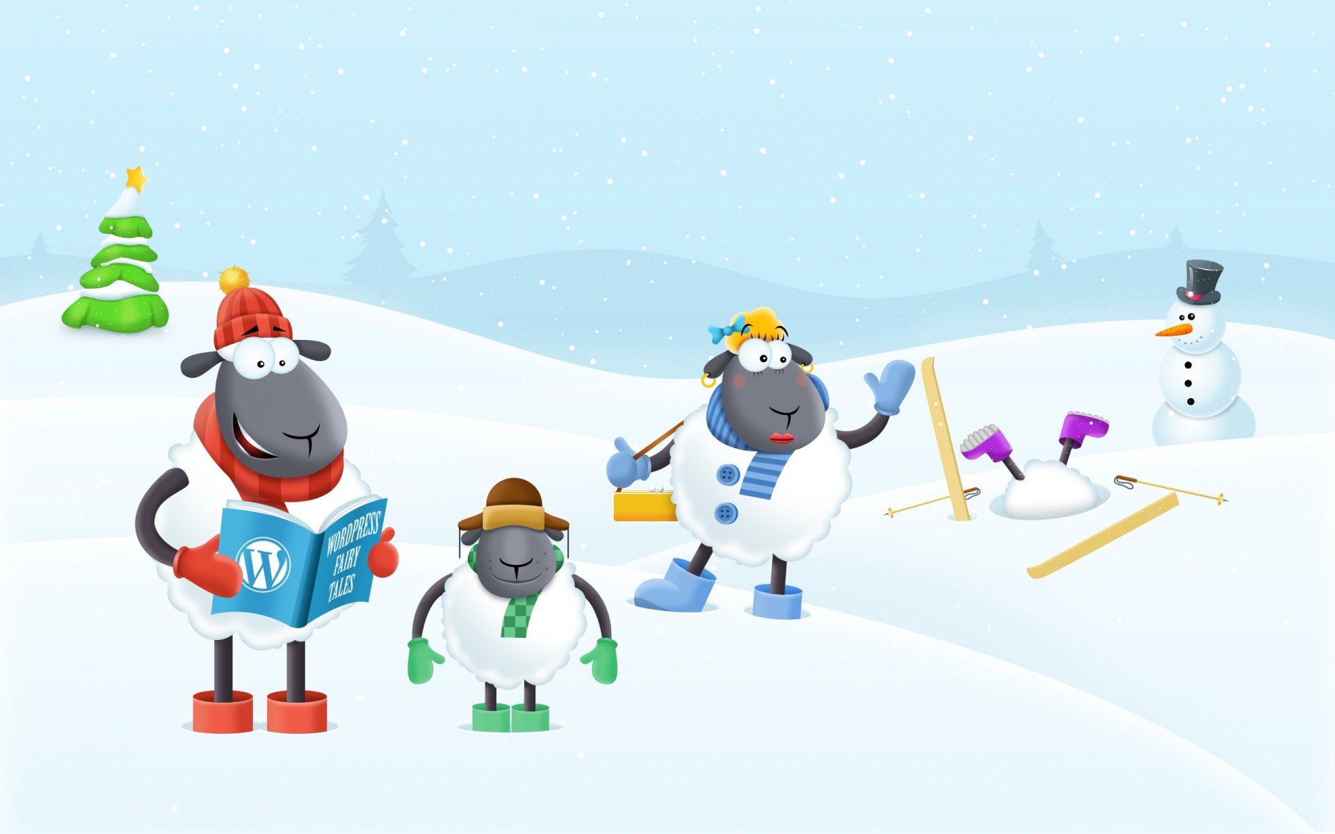Drei schafe in mützen auf schneewehen und zwei schneemännerDrei Schafe in Mützen auf Schneewehen und zwei Schneemänner