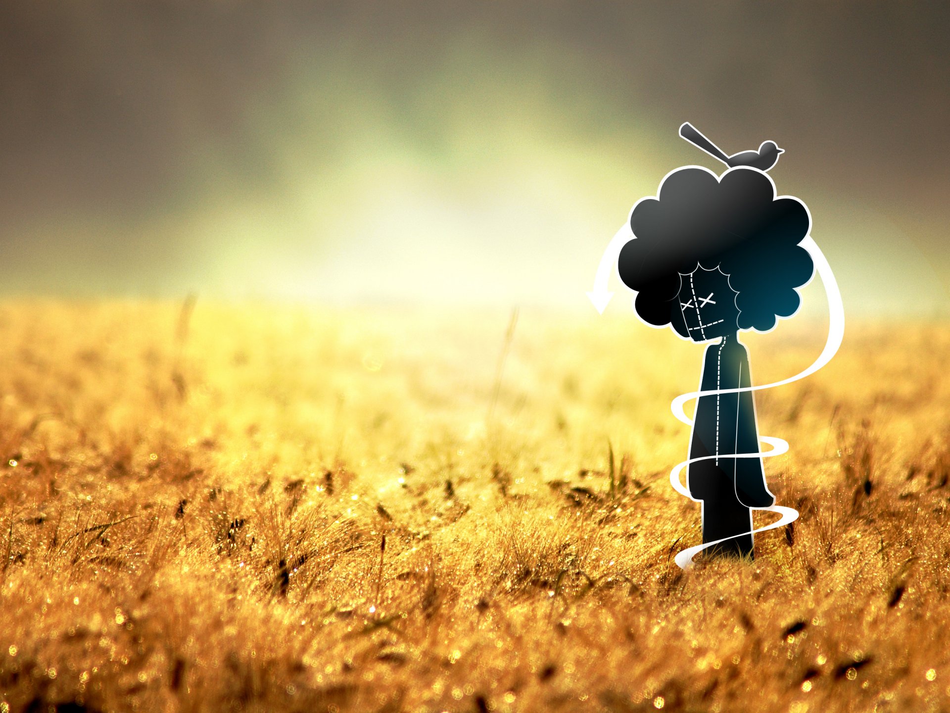 Ein cartoon-mann mit einer afro-frisur und einem vogel auf dem kopf, der in einem goldenen feld stehtEin Cartoon-Mann mit einer Afro-Frisur und einem Vogel auf dem Kopf, der in einem goldenen Feld steht