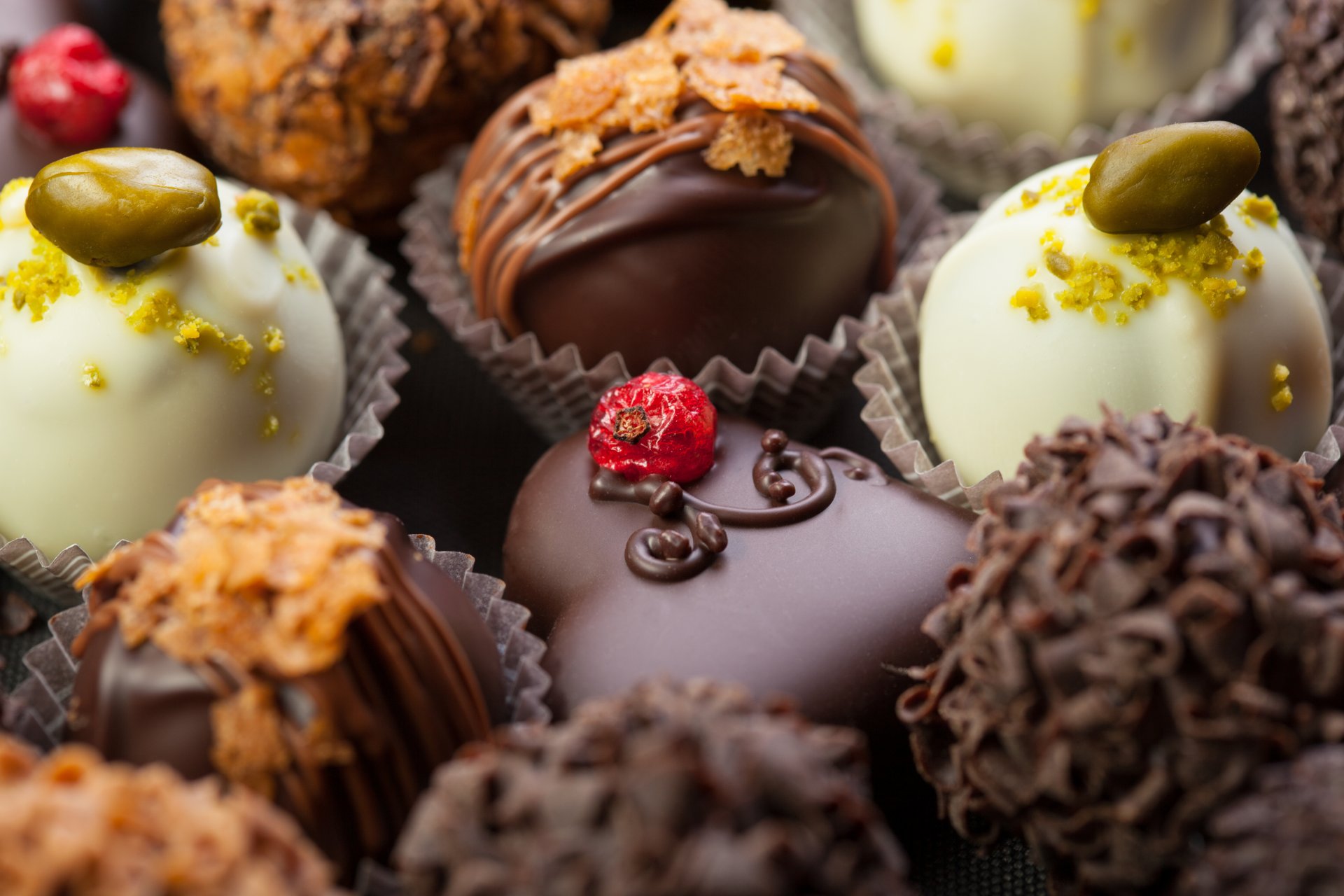 Dunkle schokoladenbonbons sind mit beeren und pistazien verziertDunkle Schokoladenbonbons sind mit Beeren und Pistazien verziert