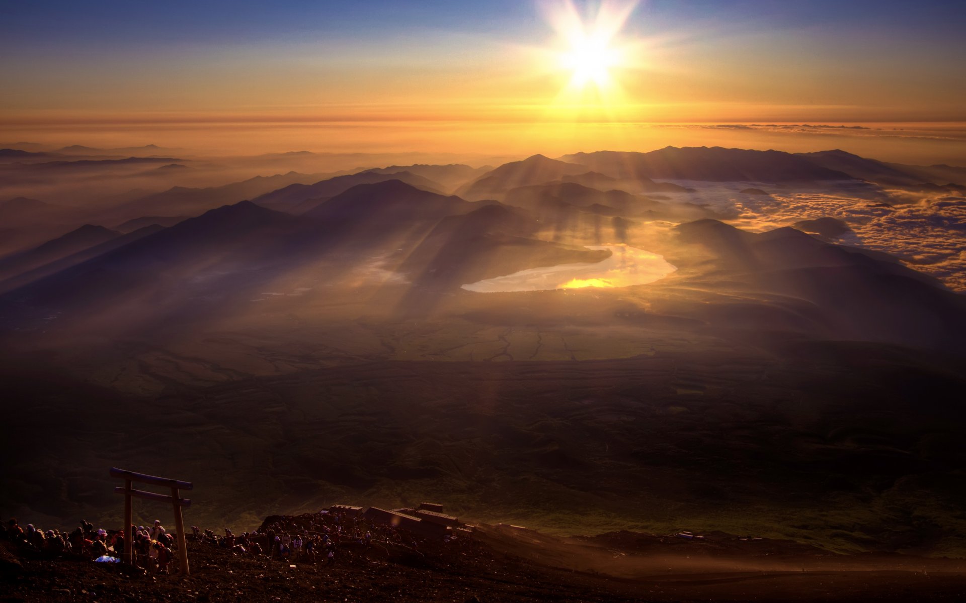 Durch die nebligen Täler späht das Sonnenlicht, sein Strahl glänzt durch Berge und Fluss