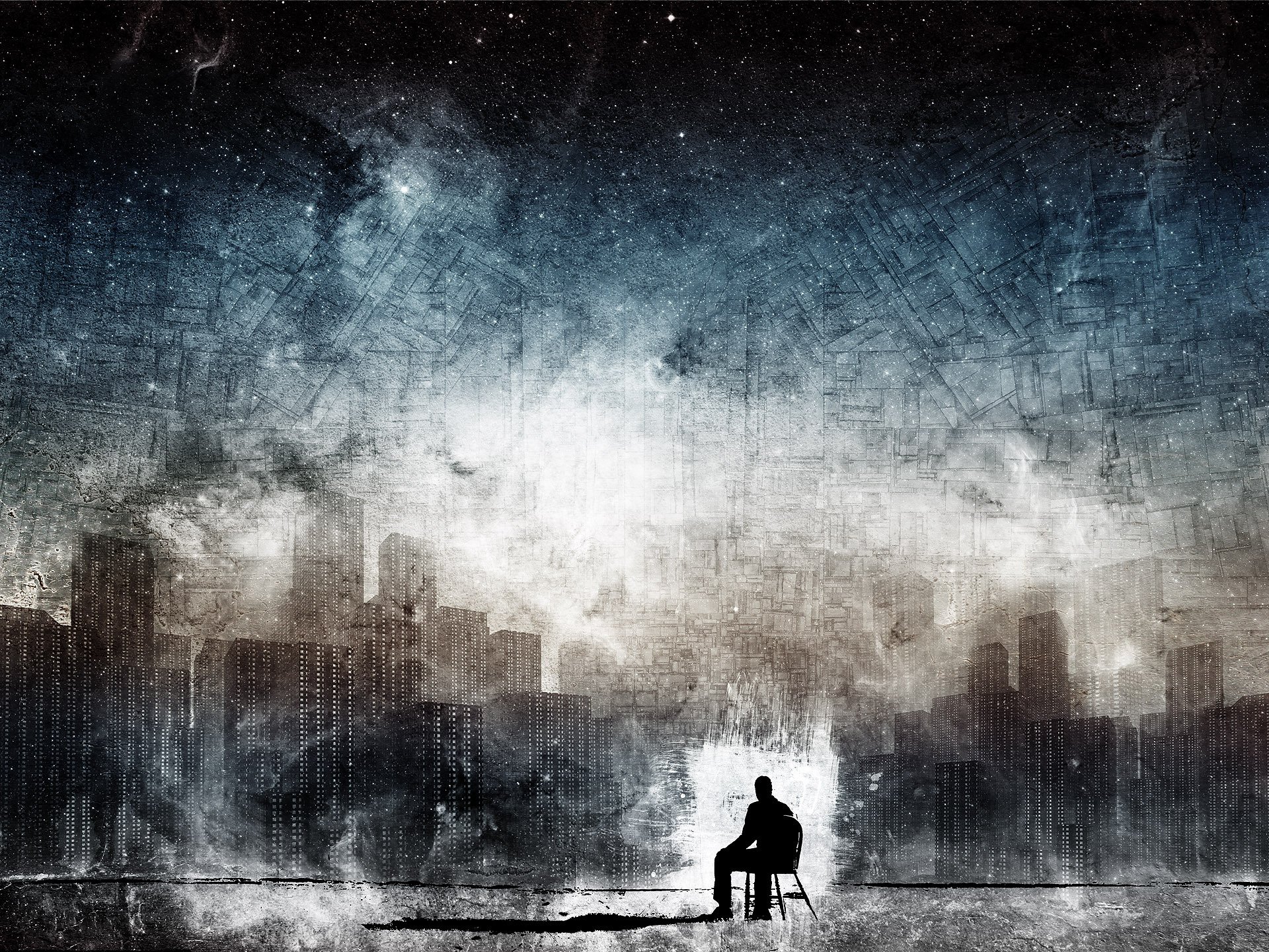 Ein mann auf einem stuhl, der über seine stadt nachdenktEin Mann auf einem Stuhl, der über seine Stadt nachdenkt
