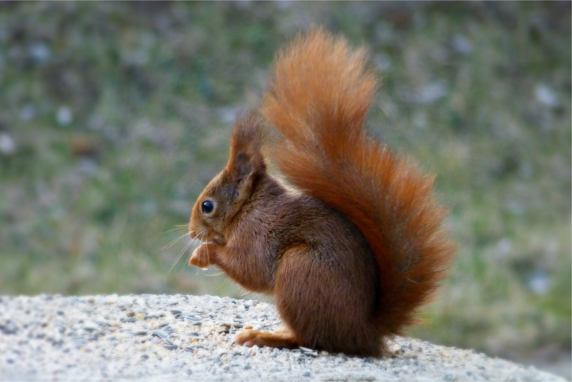 Eichhörnchen mit einem großen Schwanz auf einem Stein