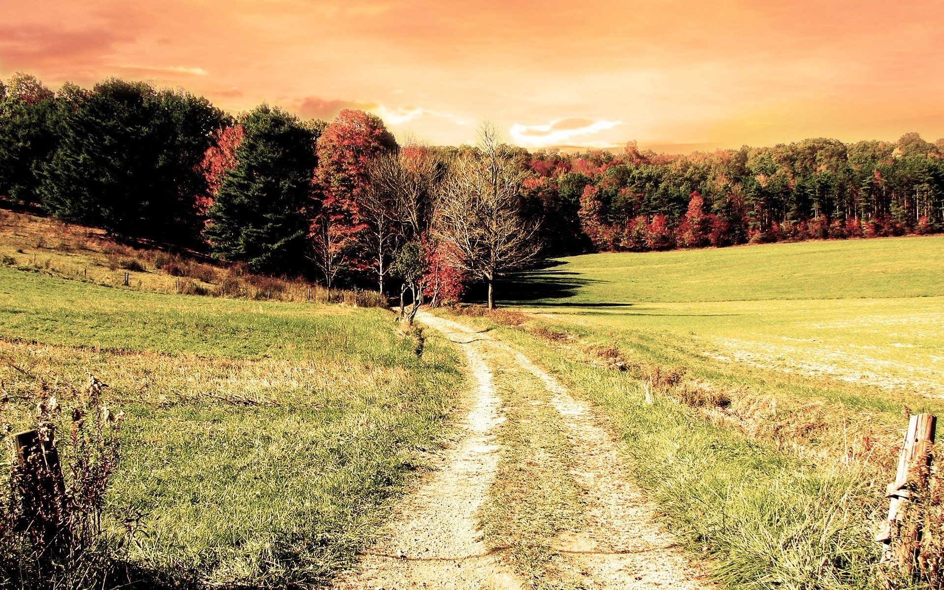 Ein schönes Feld und ein Weg, der in den Herbstwald führt