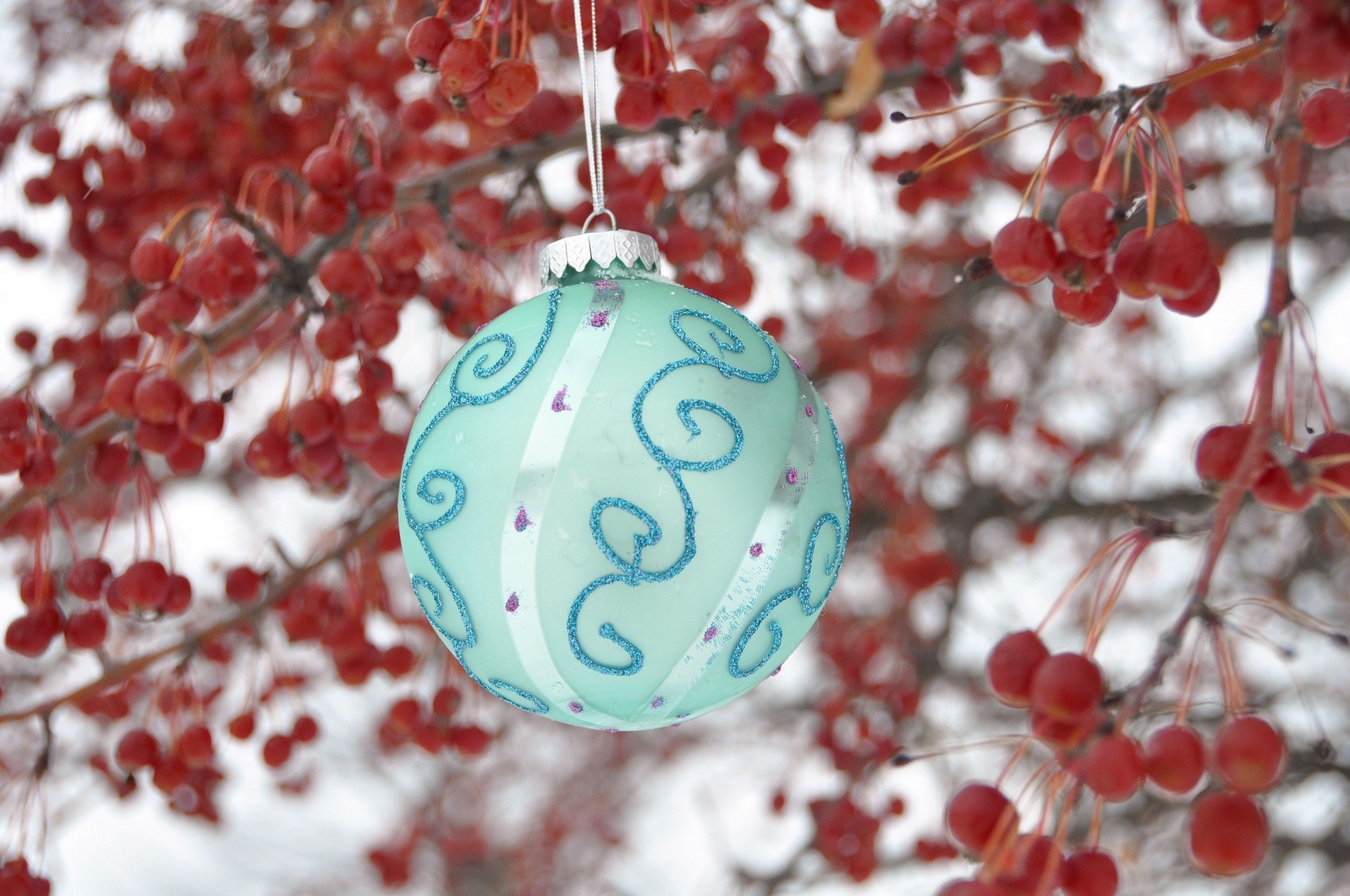 Eine türkis-weihnachtskugel mit mustern hängt im winter an weißen fäden auf dem hintergrund von zweigen mit kleinen roten äpfelnEine Türkis-Weihnachtskugel mit Mustern hängt im Winter an weißen Fäden auf dem Hintergrund von Zweigen mit kleinen roten Äpfeln