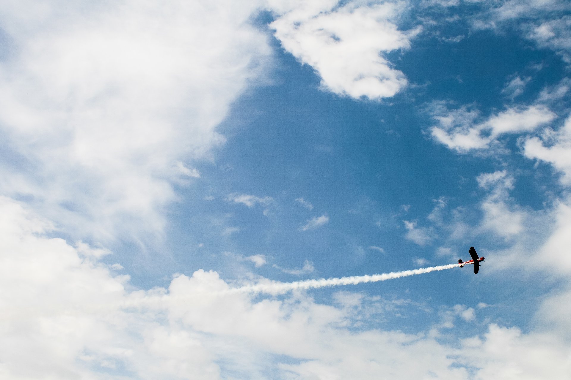 In den Wolken fliegt ein Maisflugzeug und hinterlässt eine Schleppe