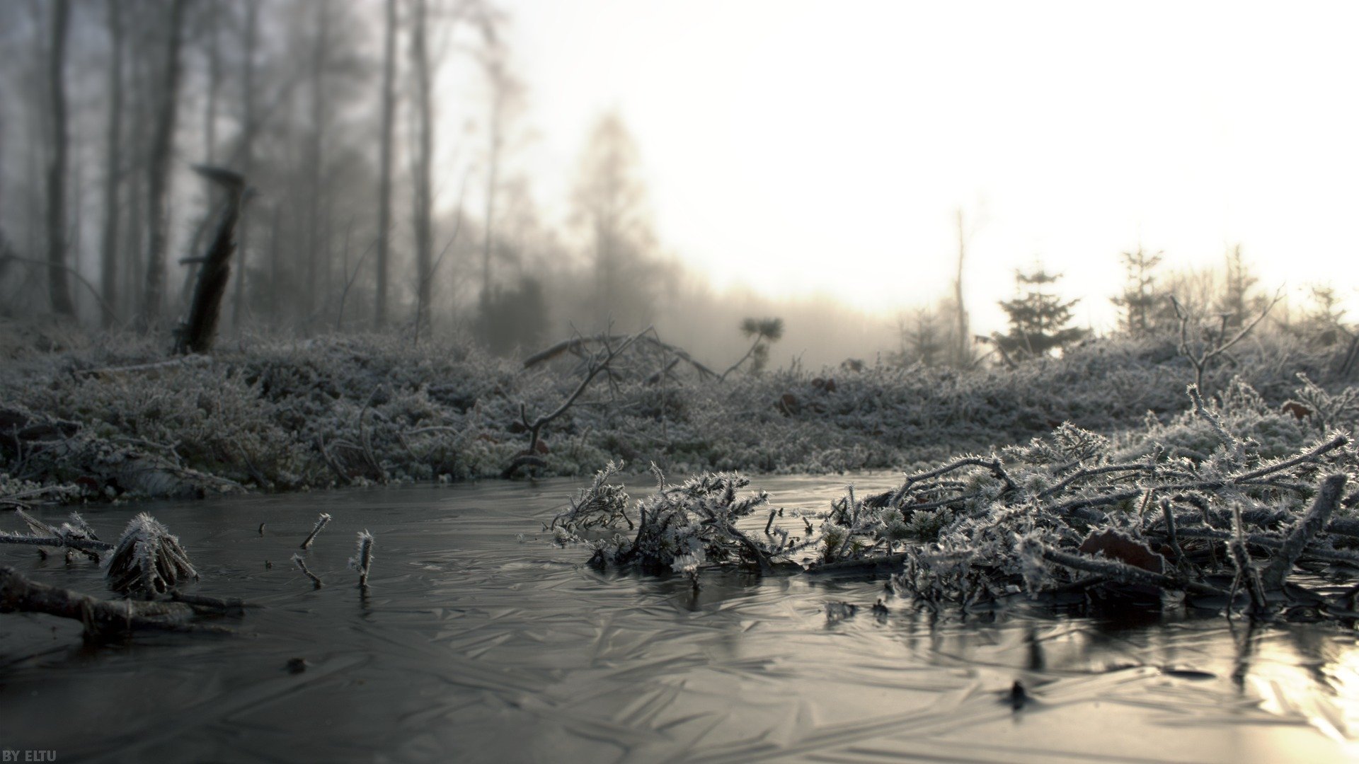 Morgendämmerung durch eis und schnee des februarwaldesMorgendämmerung durch Eis und Schnee des Februarwaldes
